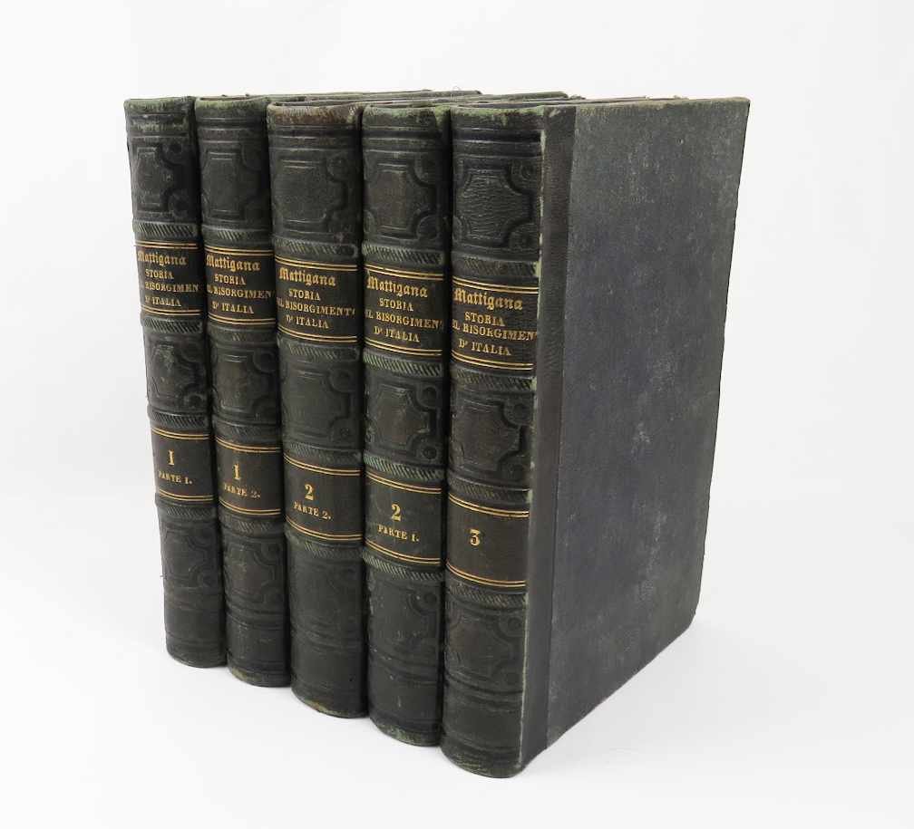 LIBROPrima edizione nell’emissione in cinque tomi, «dalla rotta di Novara».Insieme in legatura uniforme in più che buone condizioni di conservazione, completo di tutte le tavole, con i normali lievi segni del tempo marginali alla legatura, e le carte interne interessate da fioriture diffuse ma non deturpanti. Il volume terzo appartiene a una diversa emissione con sottotitolo «dalla morte di Cavour alla catastrofe di Aspromonte» (codice ICCU LO1\0312530).Nota storia del Risorgimento compilata dal poligrafo Mattigana — nom de plume di Mario Paganetti — oggi riguardata soprattutto per l’amplissimo corredo iconografico. Fu pubblicata in varie stampe ed emissioni, di cui la presente — individuabile dal sottotitolo «dalla rotta di Novara alla proclamazione del Regno» e corrispondente al codice ICCU IEI\0152436 — è la più estesa ed illustrata.Bibl.: Campanella, Bibliografia garibaldina, nn. 5450 e 5451 = 9007 e 9008 per le emissioni «da Villafranca ad Aspromonte» e «dalla morte di Cavour alla catastrofe d'Aspromonte»