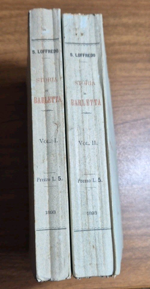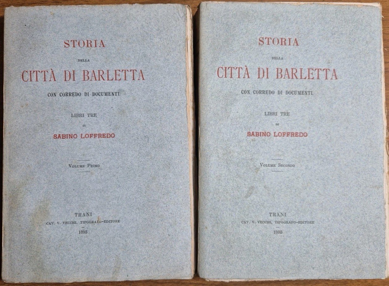 Trani, Vecchi editore 1893. XVII, 442 + 589 pagine. 2 tavole ripiegate fuori testo. dedica autografa dell’autore al primo volume. copertine editoriali in brossura. dimensioni 14,5 x 21,5 cm. stato di conservazione: ottimo (fioriture)Sabino Loffredo è riconosciuto come il più grande storico della città di Barletta, e la sua opera è considerata una pietra miliare nella documentazione storica locale . La sua prosa, pur rigorosa, è descritta come chiara e vigorosa, capace di trasmettere il piacere di una lettura gradevoleStoria della città di Barletta di Sabino Loffredo è un'opera imprescindibile per chiunque sia interessato alla storia di Barletta e della Puglia. La sua approfondita analisi e la ricca documentazione la rendono una risorsa preziosa per studiosi, storici locali e appassionati di storia.L'opera è suddivisa in tre tomi raccolti in due volumi, per un totale di oltre 1000 pagine. La trattazione copre vari aspetti della storia cittadina, tra cui:
