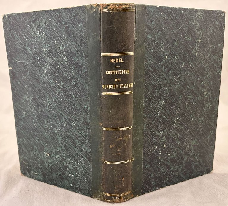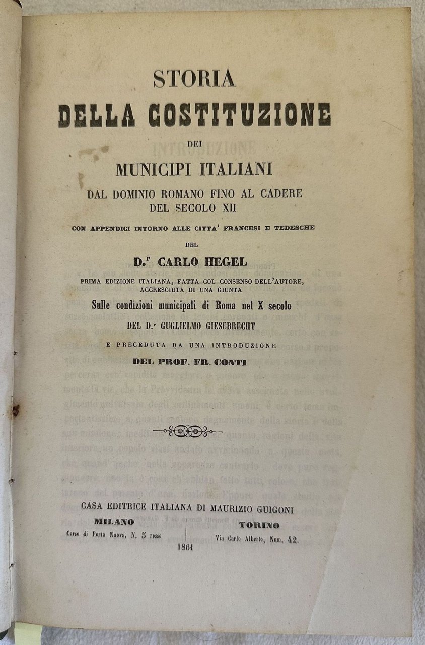 Edizione del 1861 di questa monografia sulla costituzione dei municipi italiani dal dominio romano fino alla fine del secolo XII a cura di Carlo Hegel. Appendice sulle città francesi e tedesche e un'altra sulle condizioni municipali di Roma nel X secolo di Guglielmo Giesebrecht. Introduzione a cura di Conti. In ottime condizioni. Copertina in mezza pelle con titolo e decorazioni in oro al dorso in buone condizioni con lievi usure marginali. Legatura in buone condizioni. Pagine in ottime condizioni con rare fioriture. In 8. 23,5x15,5 cm. Pp. XXXII+717+(3). Edition of 1861 of this monography about the costitution of italian municipi from roman domination to the end of 12th century by Carlo Hegel. Appendix about french and german cities and another one about conditions of Rome during 10th century by Guglielmo Giesebrecht. Introduction by Conti. In very good conditions. Half leather coeval cover with gilted title and decorations in the spine in good conditions lightly worn in the extremities. Binding in good conditions. Inside pages are in very good conditions with occasional foxing. In 8. 23,5x15,5 cm. Pp. XXXII+717+(3).