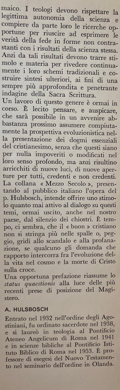 La collana Mezzo Secolo, presentando al pubblico italiano l'opera del p. Hulsbosch, intende offrire uno stimolo quanto mai attivo al dialogo su questi temi, ormai uscito, anche nel nostro paese, dal silenzio dei chiostri. È tempo, ci sembra, che il buon cristiano non si stringa più nelle spalle o, peggio, gridi allo scandalo e alla profanazione, se qualcuno gli domanda che rapporto intercorra fra l'evoluzione della vita nel cosmo e la morte di Cristo sulla croce. Una opportuna prefazione riassume lo status quaestionis alla luce delle più recenti prese di posizione del Magistero.