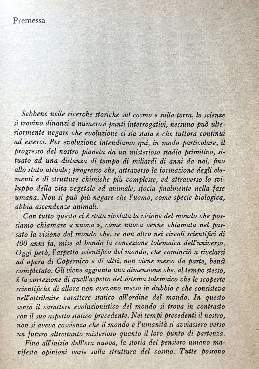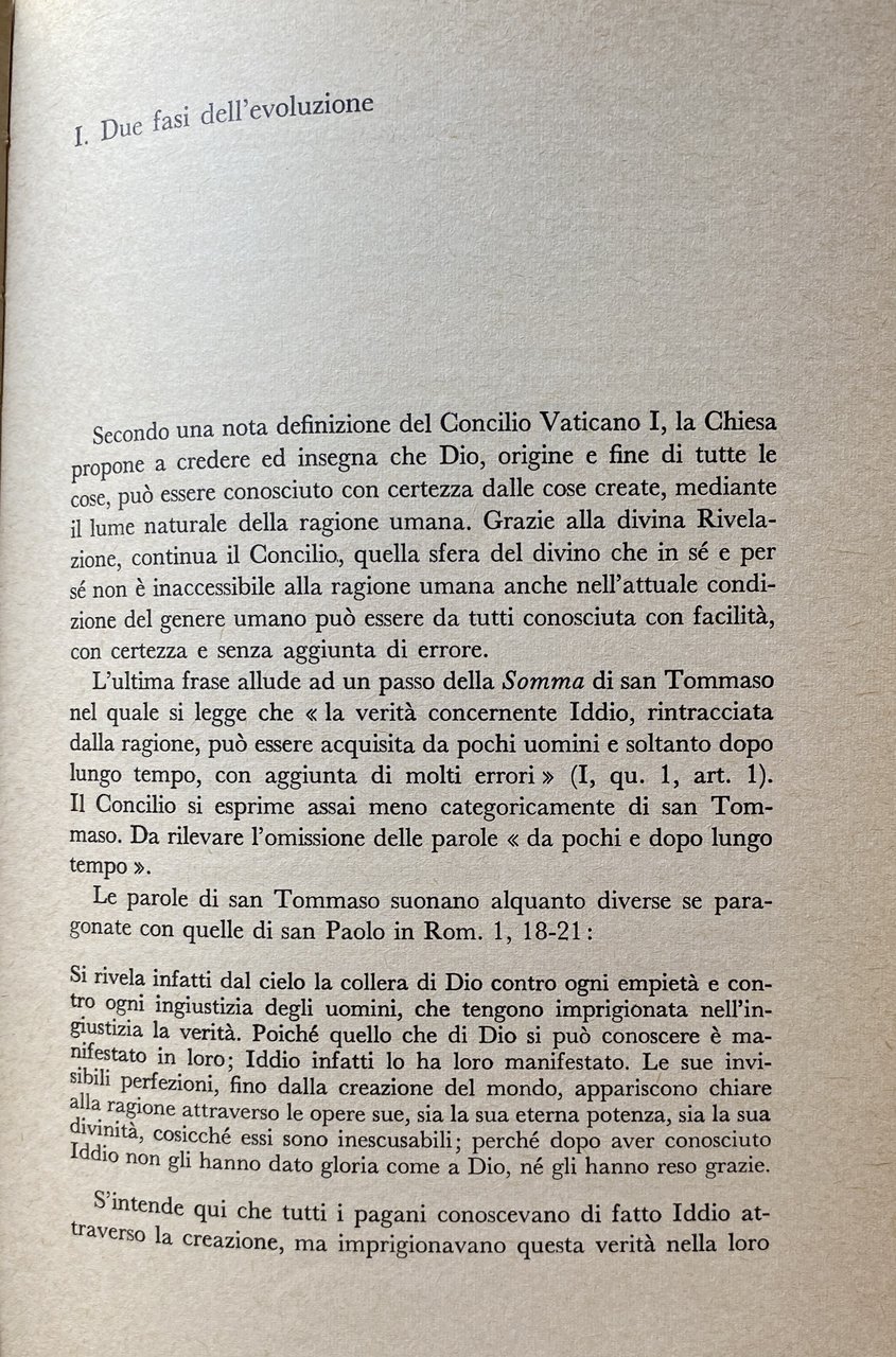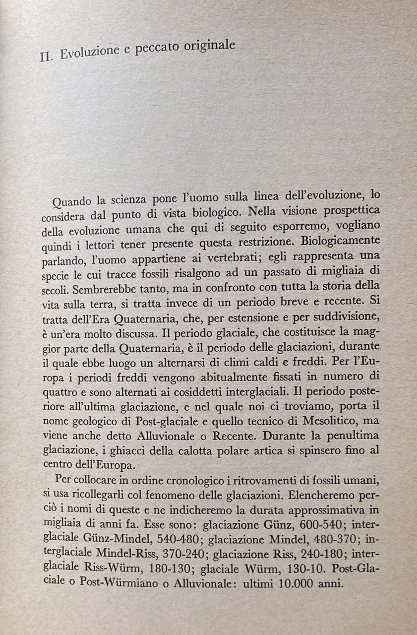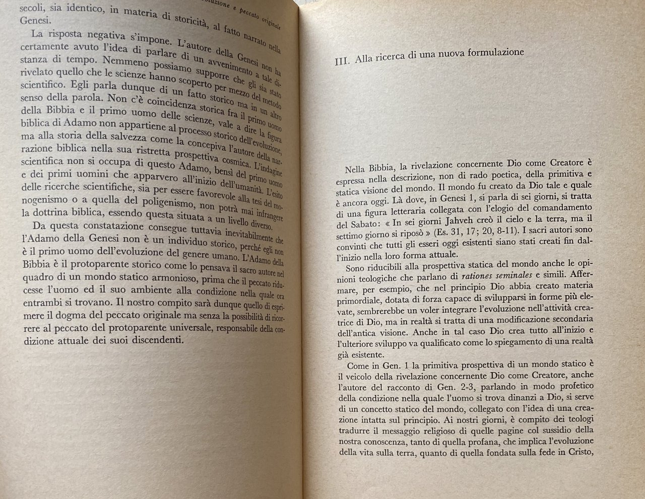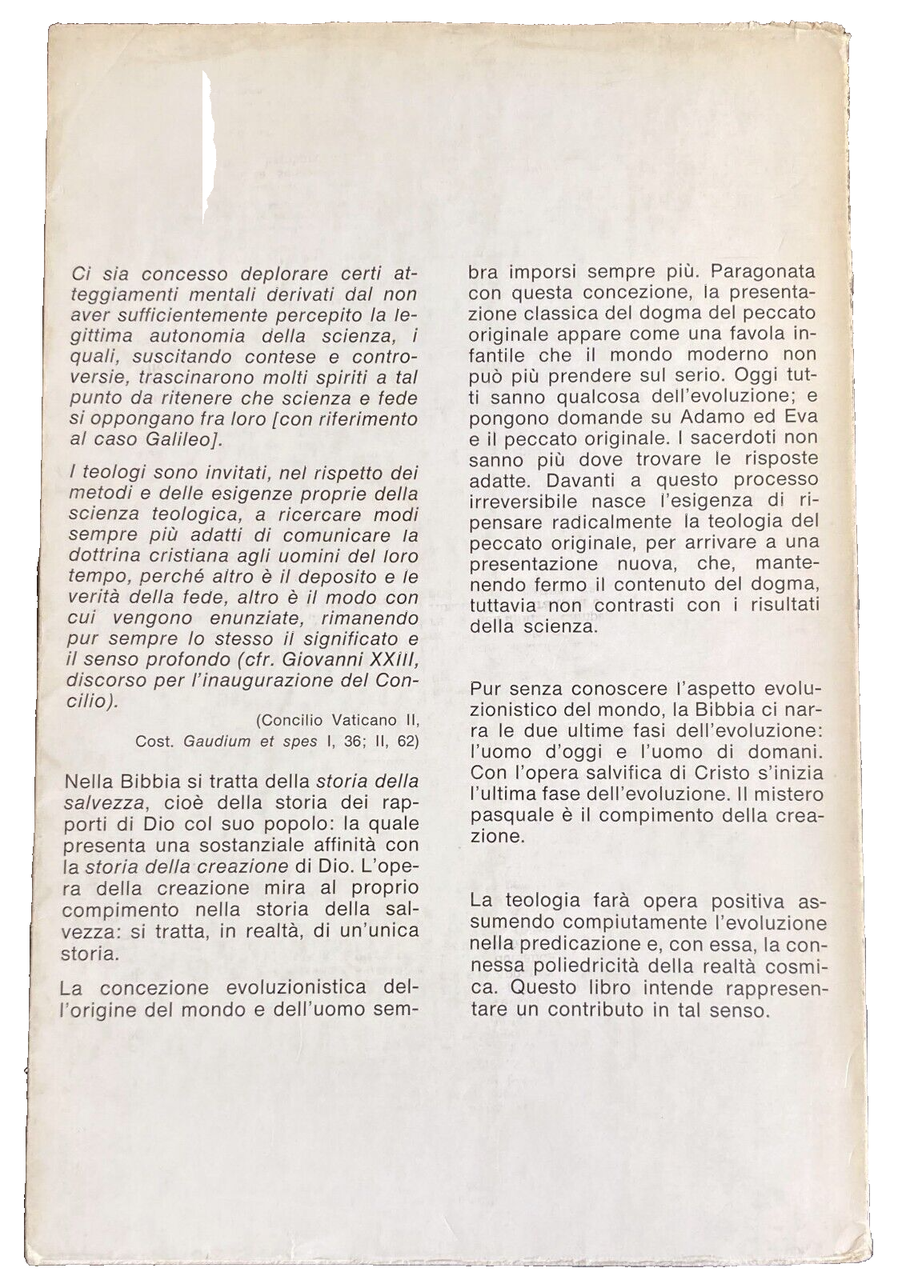È stato detto che la prospettiva evoluzionistica rappresenta, nel nostro tempo, qualcosa di simile a ciò che fu, all'inizio dell'età moderna, la rivoluzione copernicana: cioè un cambiamento abbastanza radicale nel modo di concepire il mondo. Quella prospettiva non è più una semplice ipotesi di lavoro: è il quadro culturale in cui si svolge la ricerca degli scienziati e a cui si è venuta adeguando anche la mentalità dell'uomo della strada. Questo fatto pone la riflessione teologica di fronte al compito di ripensare il mistero rivelato nella Scrittura cioè la storia dei rapporti di Dio col suo popolo al fine ultimo della salvezza in termini diversi da quelli usati dall'autore ispirato e accettati per lungo tempo come indiscussi. Rimanendo aderenti alla lettera dei primi capitoli della Genesi, si rischia una catastrofe nell'evangelizzazione: il cristianesimo, qualcuno ha detto, non può venir preso sul serio. Del resto, il Concilio Vaticano II ha già cominciato a sviluppare la fondamentale distinzione, operata da Giovanni XXIII nel Discorso d'apertura, fra il Depositum fidei, la verità rivelata, eterna, immutabilmente espressa nella parola di Dio, e la formulazione del suo rivestimento, cioè la sua traduzione in termini culturali che dipendono dalle situazioni storiche e quindi sono mutevoli col mutare dei tempi. Il Concilio ha infatti richiamato i teologi alla necessità di non ricadere mai più in casi Galileo: si ricordi quanto ha pesato l'indebito ancoramento della rivelazione cristiana al sistema cosmologico tolemaico. I teologi devono rispettare la legittima autonomia della scienza e compiere da parte loro le ricerche opportune per riuscire ad esprimere le verità della fede in forme non contrastanti con i risultati della scienza stessa. Anzi da tali risultati devono trarre stimolo e materia per rivedere continuamente i loro schemi tradizionali e costruire sintesi ulteriori, ai fini di una sempre più approfondita e penetrante indagine della Sacra Scrittura. È lecito pensare che sarà possibile in un avvenire abbastanza prossimo assumere compiutamente la prospettiva evoluzionistica nella presentazione dei dogmi essenziali del cristianesimo, senza che questi siano per nulla impoveriti o modificati nel loro senso profondo, ma anzi risultino arricchiti di nuove luci, di nuove aperture per tutti, credenti e non credenti.