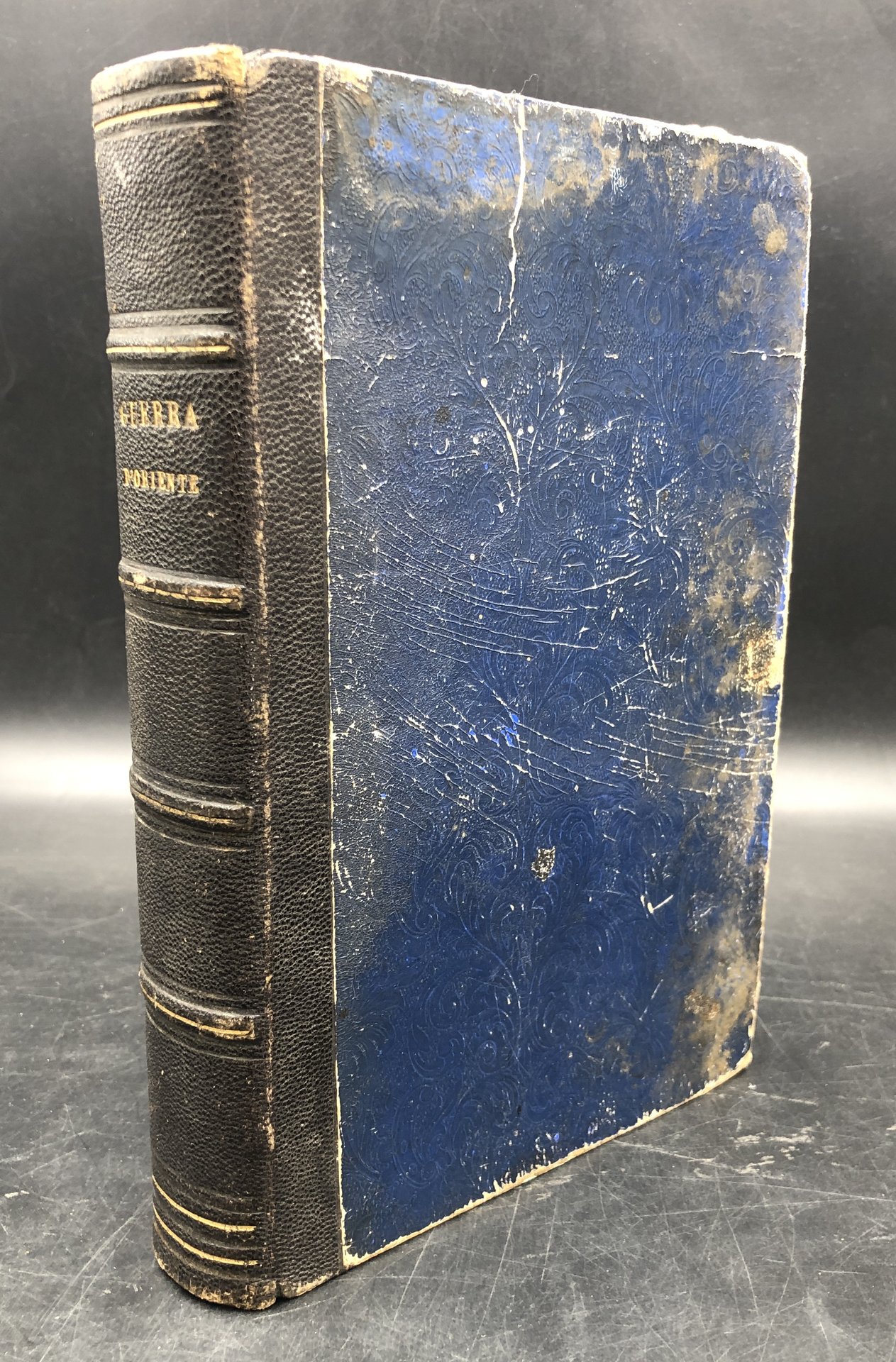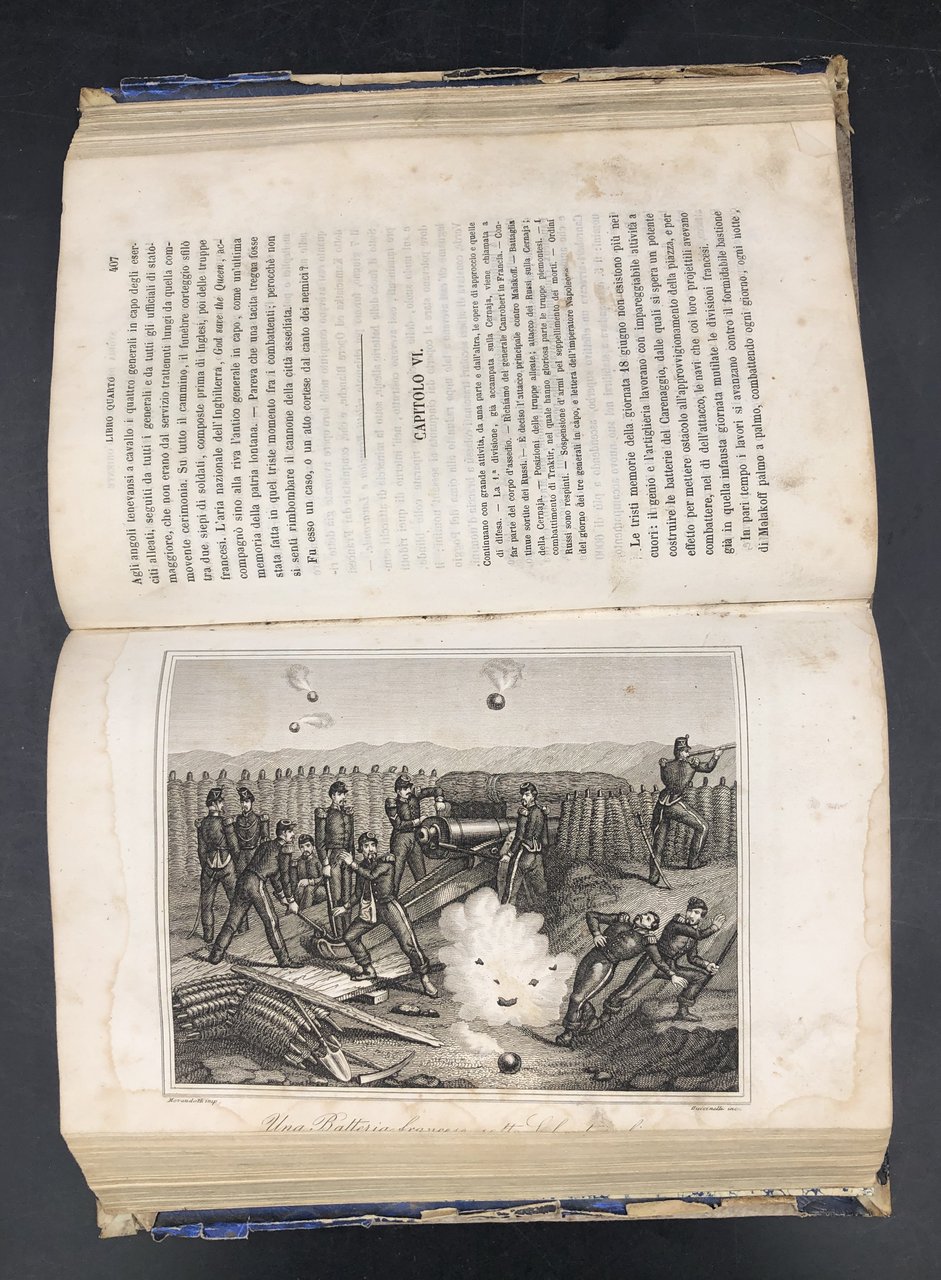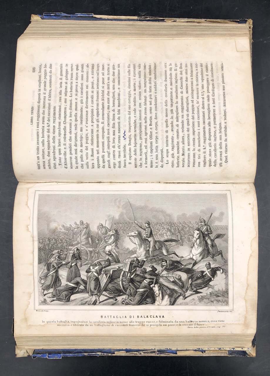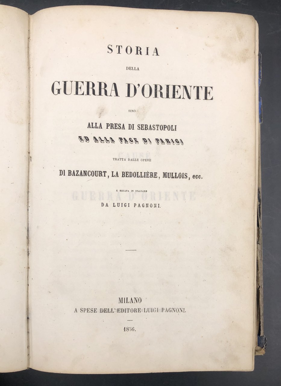 In-8° (cm. 22,2x14,5), pp. 557, (2) + 14 TAVOLE incise fuori testo (su 16: mancano io piano topografico e pittoresco di Sebastopoli, il disatro di Sinope, la morte di De Lormel). Rimangono i ritratti di Alessandro LAMARMORA (morto di colera a Balaklava nel 1855), di Napoleone III (con un'escoriazione al naso), ed di S. M. R. Vittoria (non dichiarato nell'indice), di molti generali francesi e turchi ecc., tutti incisi da Giuseppe BUCCINELLI, e animate scene di battaglie, incise una da BUCCINELLI, le altre da SANTAMARIA, disegnate da vari. Ogni ritratto (salvo q. della Regina Vittoria) è munito di un foglio in carta rosa a fronte, con ampi cenni biografico-militari. Bel dorso in pelle, 4 nervi, titolo oro; escoriazioni allo spessore dei piatti, tracce di gore ai margini delle tavole, molto raramente la testo, pelopiù immacolato. Testo di sicuro rilievo, immediatamente successivo agli eventi, dettagliato e tratto da documenti di testimoni oculari. In fine in 11 pagine, il testo italiano del Trattato tra Austri, Francia, Gran Bretagni, Prussia, Russia, Regno di Sardegna, e Turchia. Benché mutilo del piano topografico e di 2 tavole, non comune e di rilievo. Così com'è
