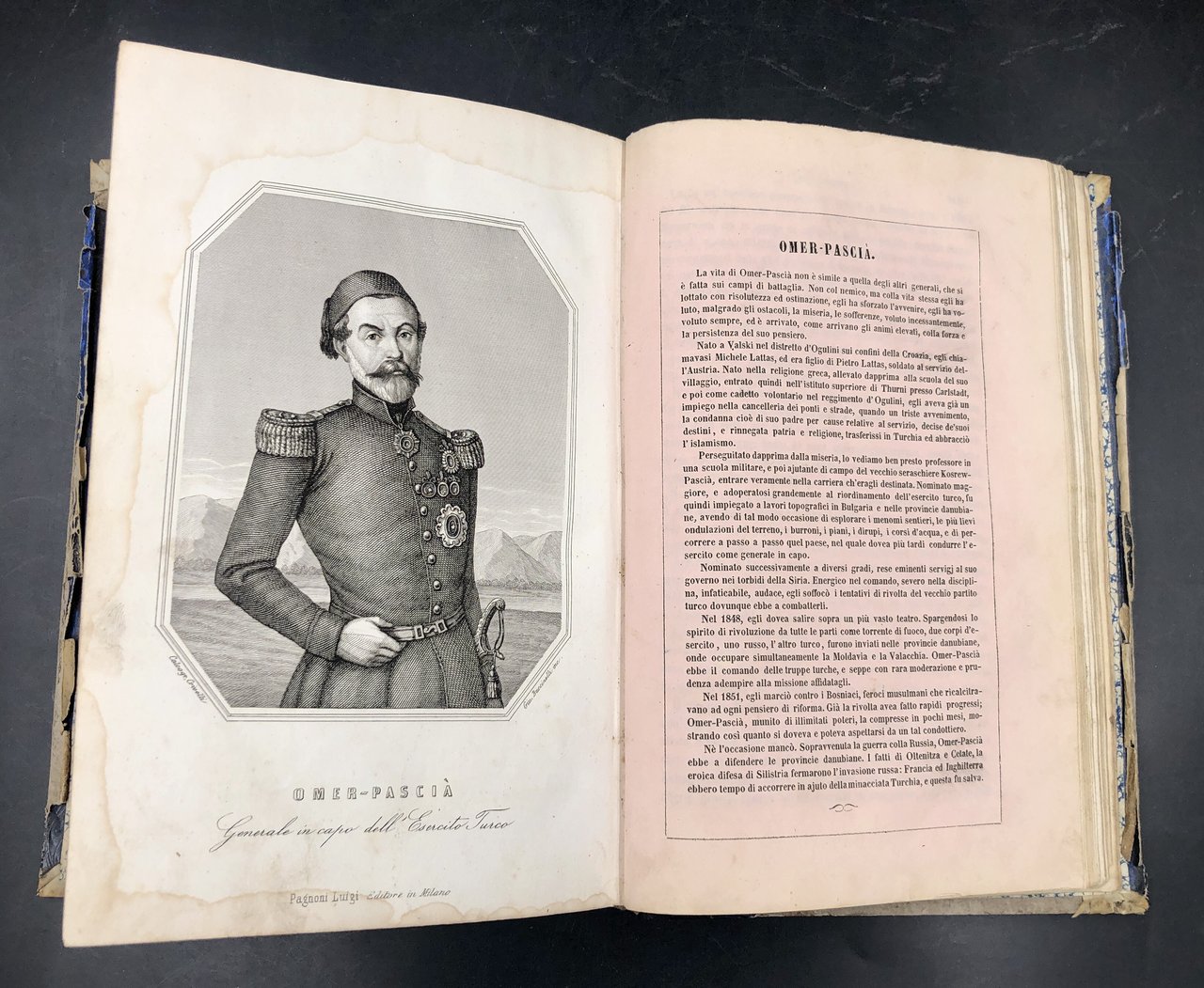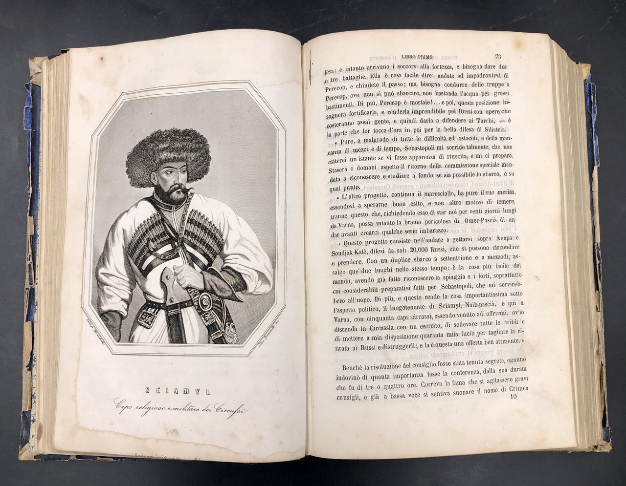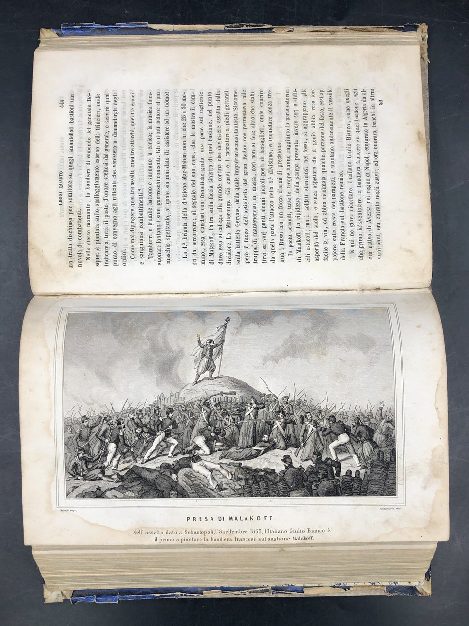 In-8° (cm. 22,2x14,5), pp. 557, (2) + 14 TAVOLE incise fuori testo (su 16: mancano io piano topografico e pittoresco di Sebastopoli, il disatro di Sinope, la morte di De Lormel). Rimangono i ritratti di Alessandro LAMARMORA (morto di colera a Balaklava nel 1855), di Napoleone III (con un'escoriazione al naso), ed di S. M. R. Vittoria (non dichiarato nell'indice), di molti generali francesi e turchi ecc., tutti incisi da Giuseppe BUCCINELLI, e animate scene di battaglie, incise una da BUCCINELLI, le altre da SANTAMARIA, disegnate da vari. Ogni ritratto (salvo q. della Regina Vittoria) è munito di un foglio in carta rosa a fronte, con ampi cenni biografico-militari. Bel dorso in pelle, 4 nervi, titolo oro; escoriazioni allo spessore dei piatti, tracce di gore ai margini delle tavole, molto raramente la testo, pelopiù immacolato. Testo di sicuro rilievo, immediatamente successivo agli eventi, dettagliato e tratto da documenti di testimoni oculari. In fine in 11 pagine, il testo italiano del Trattato tra Austri, Francia, Gran Bretagni, Prussia, Russia, Regno di Sardegna, e Turchia. Benché mutilo del piano topografico e di 2 tavole, non comune e di rilievo. Così com'è
