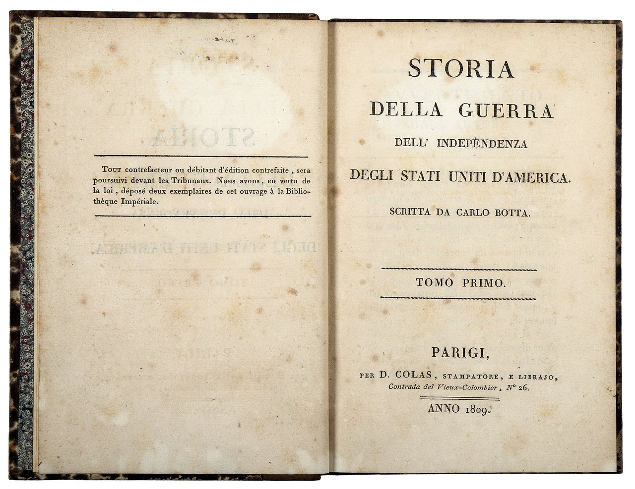 “Carlo Botta was best-known historian of his generation, a household name even among intellectuals outside Italy. His weighty ‘History of American War of Independence' is divided into four volumes and fourteen chapters. The original Italian edition was printed in France in 1809, followed by editions published in Parma between 1817 and 1819, and a Milanese edition in 1819. There are four more Italian editions printed before 1856. The first French translation appeared in 1812, the first American translation in 1820-21 […] Within the Risorgimento's political debates, after his early republicanism, Botta emerged as a moderate Liberal, who was disillusioned with the French experiences in Northern Italy and perceived Napoleonic rule as a form of depotism […] Botta's interest in American history served as a contrast to these European experiences […]” (A. Körner, America in Italy. The United States in the Political Thought and Imagination of the Risorgimento, 1763-1865, Princeton, 2017, pp. 47-48).