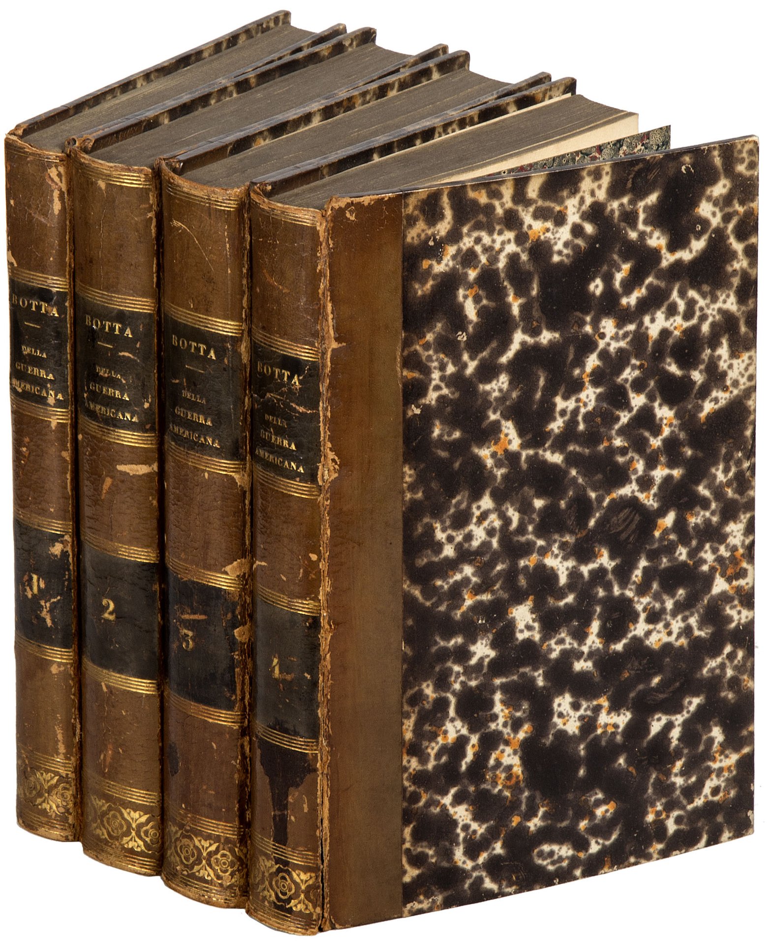 Rara prima edizione di quest'opera dell'illustre patriota e storico canavesano Carlo Botta, composta a Parigi dove si trovava in qualità di membro del Corpo Legislativo. Si tratta della prima vasta opera storica dell'autore, nella quale viene sottolineato l'amore per la libertà, incarnato dalla società americana ed in particolare da George Washington, in contrapposizione ai valori promossi dalla rivoluzione francese ed incarnati da Napoleone Bonaparte. L'opera si conclude con il discorso tenuto da Washington al Congresso nel 1783 e con il suo successivo ritiro a Mount Vernon.