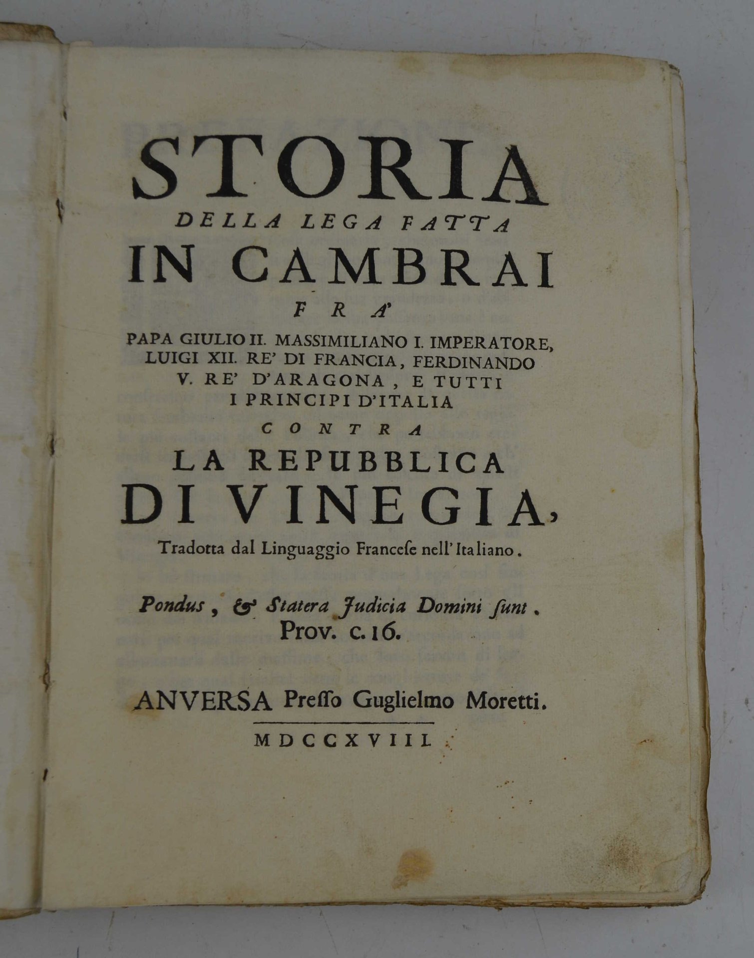 Cm. 25, pp. (16) 414 (22). Legatura coeva in cart. alla rustica con nervi passanti e titoli ms. al dorso. Una mancanza al dorso, alcune scritte alle sguardie ed un piccolo lavoro di tarlo limitato a poche carte finali, peraltro esemplare genuino e marginoso. Dotta opera che, descrivendo minuziosamente i dettati della Lega di Cambrai, ci informa sulla riduzione territoriale della Repubblica di venezia. Edizione originale ed unica in lingua italiana. Opera che fu messa all'indice dei libri proibiti. Cfr. Melzi, II, 49-50.