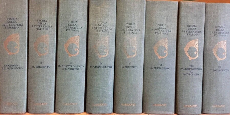 Opera incompleta, manca il Volume VII. Direttori, Emilio Cecchi e Natalino Sapegno. Vol I Le origini e il Duecento, 785p, 154 illustrazioni, 64 tavole a colori; Volume II, Il Trecento, 773 p; Vol III, Il Quattrocento e l'Ariosto, 911 p; Vol IV, Il Cinquecento, 825 p; Vol V Il Seicento, 941 p; Vol VI, Il Settecento, 1090 p; Vol VIII, Il Novecento, 823 p; Indice Analitico dell'Opera, Vol IX, 994 p. Volumi rilegati in tela in buone condizioni. Pagine interne chiare, con lieve fioritura. Dorso saldo e legatura ferma. Numero Pagine 7124