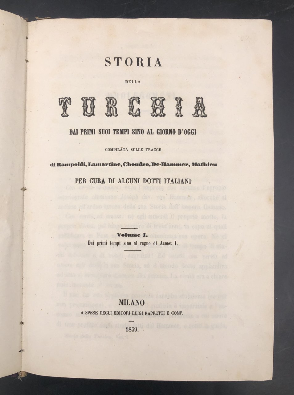 Storia della TURCHIA dai primi suoi tempi sino al giorno d'oggi. Opera completa dei due volumi, ma mutila di 20 tavole. Include 30 pagine sulla "Condizione della GRECIA e sua SOLLEVAZIONE".