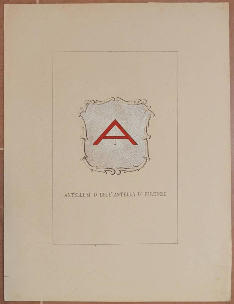 In 4. Dim. 32,5x24,5 cm. Pp. (3). Edizione del 1872 di questa interessante storia genealogica delle famiglie illustri italiane. L'opera, pubblicata a dispense in quattro volumi, riportava la storia di ogni famiglia presente nella raccolta e relativo stemma nobiliare splendidamente acquarellato a mano. Proponiamo il fascicolo sulla Famiglia Antellesi o dell'Antella di Firenze. Il testo scritto è di due pagine. Bellissimo stemma a piena pagina acquarellato coevo. In buone condizioni. Copertina assente. Legatura assente. Pagine in ottime condizioni con rare fioriture, margini con usure non rifilati. Edition of 1872 of this interesting genealogical history of noble italian families. The work, published in instalments in four volumes, described the history of each family in the collection and relative coat of arms coloured with acquarello by hand. We propose the pamphlet about Family Antellesi or Dell'Antella from Florence. The written text is made up of two pages. Very beautiful coat of arms coeval painted with acquarello by hand. In good conditions. Cover is missing. Binding is missing. Inside pages are in very good conditions with occasional foxings, edges are uncut with wearings.