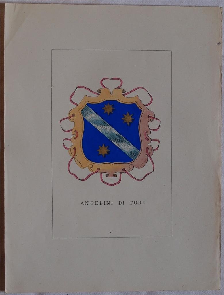 In 4. Dim. 32x14 cm. Pp. (4). Edizione del 1872 di questa interessante storia genealogica delle famiglie illustri italiane. L'opera, pubblicata a dispense in quattro volumi, riportava la storia di ogni famiglia presente nella raccolta e relativo stemma nobiliare splendidamente acquarellato a mano. Proponiamo il fascicolo sulla Famiglia Angelini di Todi. Il testo scritto è di tre pagine. Bellissimo stemma a piena pagina acquarellato coevo. In buone condizioni. Copertina assente. Legatura assente. Pagine in ottime condizioni con rare fioriture, margini con usure non rifilati. Edition of 1872 of this interesting genealogical history of noble italian families. the work, published in instalments in four volumes, described the history of each family in the collection and relative coat of arms coloured with acquarello by hand. We propose the pamphlet about Family Angelini from Todi. The written text is made up of three pages. Very beautiful coat of arms coeval painted with acquarello by hand. In good conditions Cover is missing. Binding is missing. Inside pages are in very good conditions with occasional foxings, edges are uncut with wearings.