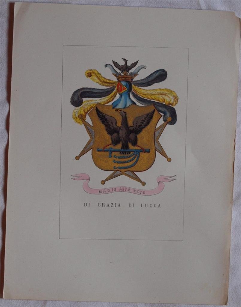 In 4. Dim. 32x14 cm. Pp. (9). Edizione del 1872 di questa interessante storia genealogica delle famiglie illustri italiane. L'opera, pubblicata a dispense in quattro volumi, riportava la storia di ogni famiglia presente nella raccolta e relativo stemma nobiliare splendidamente acquarellato a mano. Proponiamo il fascicolo sulla Famiglia Di Grazia di Lucca. Il testo scritto da F. Galvani è di otto pagine. Bellissimo stemma a piena pagina acquarellato coevo. In buone condizioni. Copertina assente. Legatura assente. Pagine in ottime condizioni con fioriture, margini con usure non rifilati.Edition of 1872 of this interesting genealogical history of noble italian families. The work, published in instalments in four volumes, described the history of each family in the collection and relative coat of arms coloured with acquarello by hand. We propose the pamphlet about Family Di Grazia from Lucca. The written text by F. Galvani is made up of eight pages. Very beautiful coat of arms coeval painted with acquarello by hand. In good conditions. Cover is missing. Binding is missing. Inside pages are in very good conditions with foxings, edges are uncut with wearings.