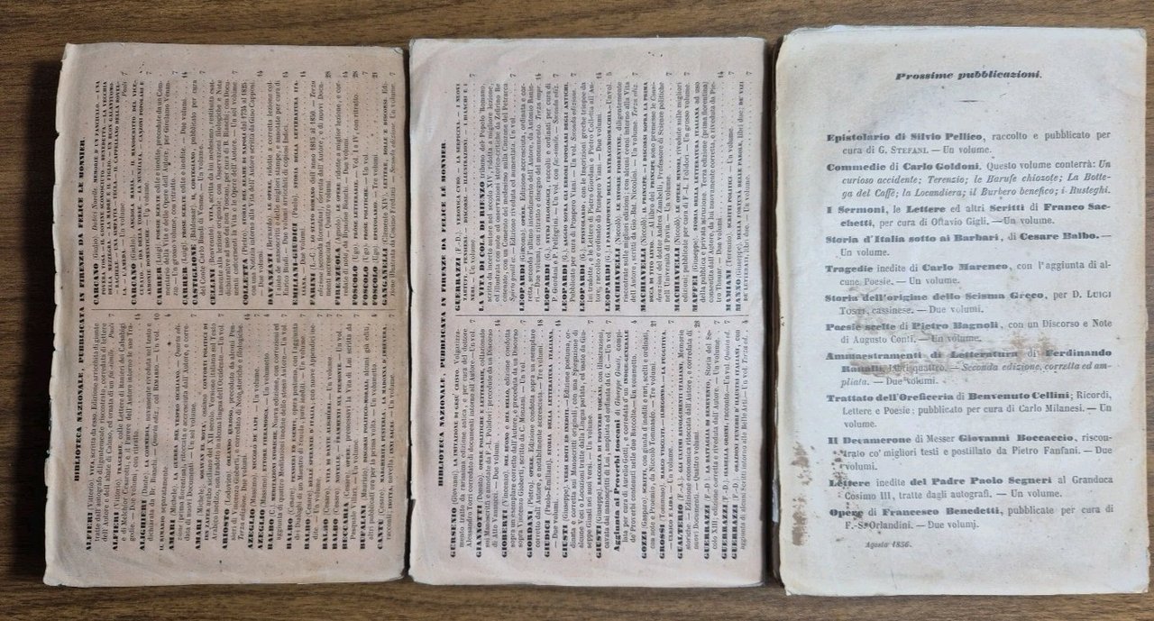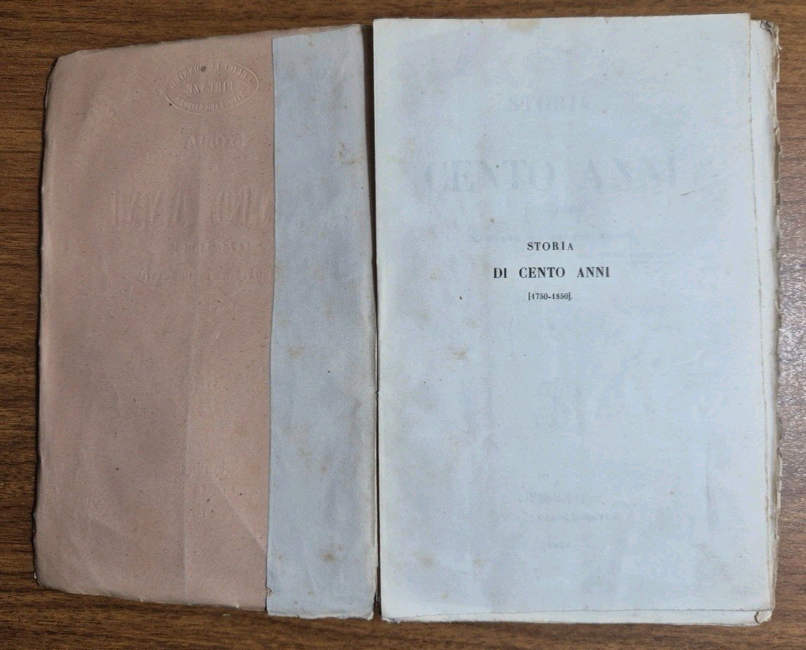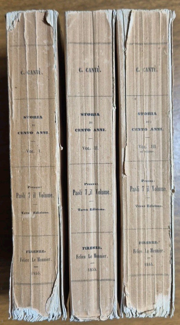 STORIA DI CENTO ANNI 1750 1850 di Cesare Cantù. Opera Completa in 3 volumi. Firenze, Felice Le Monnier Editore, 1855. 528 + 596 + 628 pagine. Copertine editoriali in brossura. dimensioni 12 x 18,5 cm. stato di conservazione: buono (fioriture, copertine con piccole mancanze e altre imperfezioni) L'opera è una sintesi storica che copre un secolo di trasformazioni politiche, sociali, culturali e scientifiche in Europa e nel mondo, con particolare attenzione all'Italia.