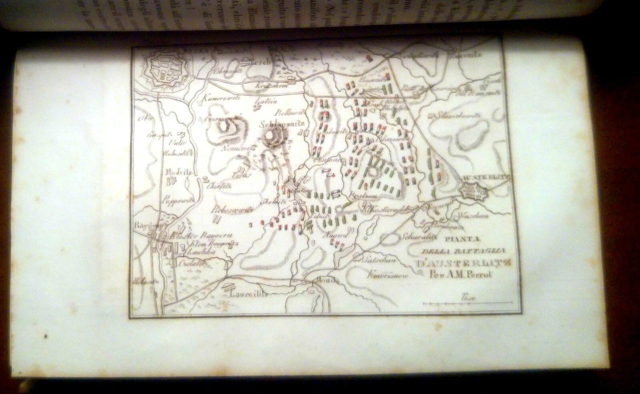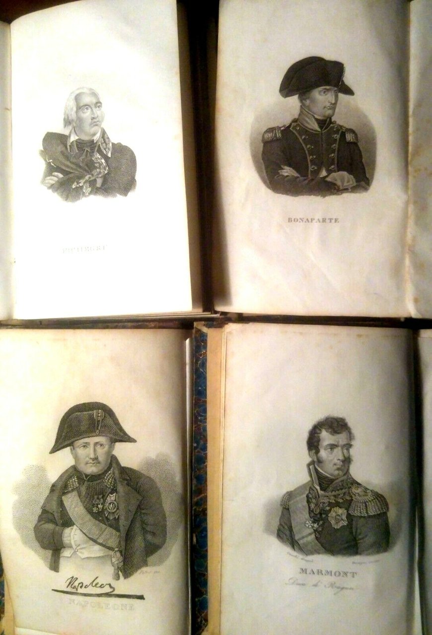 (XXVII), 477 + 466 + 447 + 487, (IV) pagine. 19 carte topografiche, 18 bellissime tavole più volte ripiegate (più due mutile della metà) e 17 ritratti. Copertine coeve in mezza pelle con titoli dorati al dorso, piatti marmorizzati, tagli azzurrati. Dimensioni: 14 x 22 cm. Stato di conservazione: molto buono (pagine ingiallite, sporadiche fioriture, imperfezioni alle copertine, mancano almeno 23 tra tavole, carte topografiche e ritratti, due carte sono mutilate di metà. Nello stesso anno viene stampato un volume di Massime di Napoleone relativamente alla guerra a volte considerato 5° volume di quest'opera e a noi mancante, pochissime scritte a matita leggera)