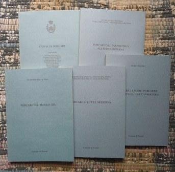 Opera completa in cinque volumi. Prima edizione. Introduzione di Renzo Giometti, Martino Giusti e Francesco Ambrogi. Cm.21,4x15,6. Pg.620 complessive. Brossure editoriali con sovracoperte. Custodia editoriale. Illustrazioni in nero. Vol.I: Presentazione; Voil.II: "Porcari dal paleolitico all'epoca romana", di Daniela Ciocchi Genick, Paolo Mencacci e Michelangelo Zecchini; Vol.III: "Porcari e i nobili porcaresi, un castello, una consorteria", di Mario Seghieri; Vol.IV: "Porcari nel secolo XIX" di Giampiero Della Nina; Vol.V: "Porcari nell'età moderna", di Giuseppe Ghilarducci, Franco Dal Porto, Ubaldo Ceccarelli e Guglielmo Lera. In cofanetto rigido, come nuovi, un piccolo foro in basso al dorso del terzo volume