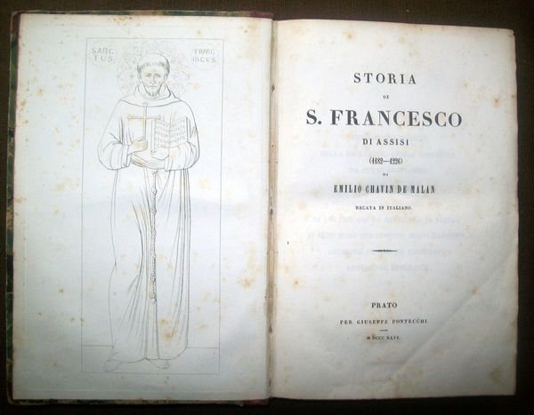 In -8, pp. XXX - 342 - cxlvii (5). Con una antiporta raffigurante il Santo. Leg. mezza pelle dell'epoca con dorso muto. Traduzione di Cesare Guasti sulla seconda edizione francese. La prima edizione di questa importante biografia francescana fu pubblicata a Parigi nel 1845. L'opera comprende, oltre alla storia di S. Francesco di Assisi, 147 pagine di note con una Bibliografia, le Poesie, le Liturgie e le Arti che hanno rappresentato la vita del Santo.