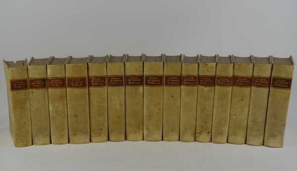 Trenta volumi legati in quindici di cm. 18, pp. 7500 ca. complessive. Con antiporta figurata al primo volume, frontespizi in rosso e nero e 256 tavole f.t. incise in rame (anche ripiegate). Solida legatura coeva in piena pergamena rigida con titoli in oro su tasselli ai dorsi. Esemplare completo, particolarmente genuino e ben conservato.