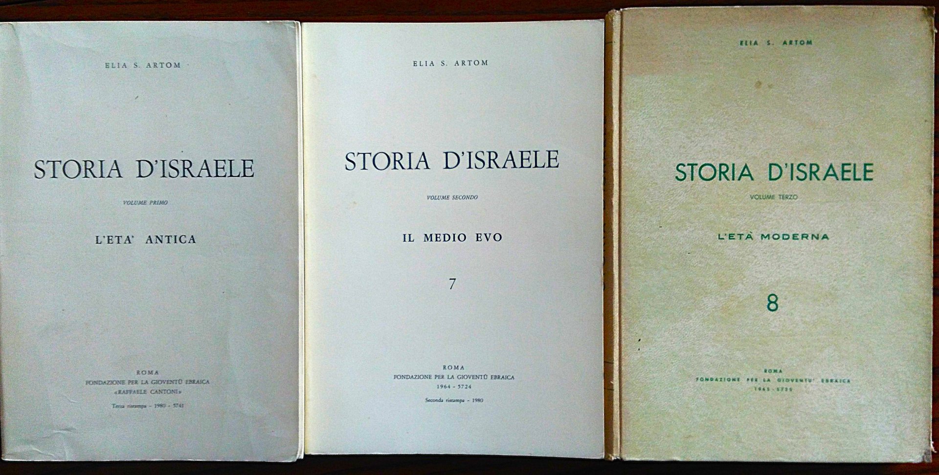 Roma, Fondazione per la Gioventu' Ebraica, 1965-1980. 8°, tre volumi, illustrazioni, legature editoriali. Volume Primo - L'Età Antica, pp. 278; Volume Secondo - Il Medio Evo, pp. 143; Volume Terzo -L'Età Moderna, pp. 266. Segni d'uso agli angoli della copertina del terzo volume, belle copie. I primi due volumi sono in brossura editoriale, il terzo in cartone editoriale.
