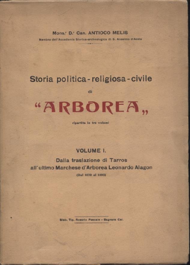 Storia politica - religiosa - civile di 'Arborea'. Volume I. Dalla traslazione di Tarros all'ultimo Marchese d'Arborea Leonardo Alagon (dal 1070 al 1493)