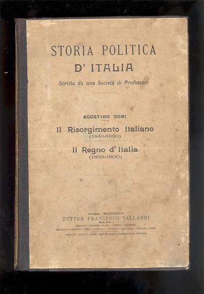 IN 8 ( cm.27 X 19 ), pp.VI, 622, ERRATA CORRIGE. COPERTINA COEVA IN TUTTA TELA RIGIDA CON APPLICATA AI PIATTI LA COPERTINA ORIGINALE RIPORTATA ANCHE AL DORSO. L'OPERA, E' DIVISA IN CINQUE CAPITOLI OGNIUNO CON CORPOSA BIBLIOGRAFIA IN FINE. CAP.1°, LA RESISTENZA. CAP.2°, IL PIEMONTE ITALIANO ( 1855 - 1859 ). CAP.3°, IL REGNO D'ITALIA ( 1859 - 1861 ), CAP.4°, LA VENEZIA ( 1861 - 1866 ). CAP.5°, ROMA ( 1866 - 1870 ). CAP.5°, PARTE II, L'ITALIA CONTEMPORANEA ( 1870 - 1900 ). PREFAZIONE DI AGOSTINO GORI. LIEVI TRACCE D'USO, ALTRIMENTI OTTIMA CONSERVAZIONE GENERALE ID 4261