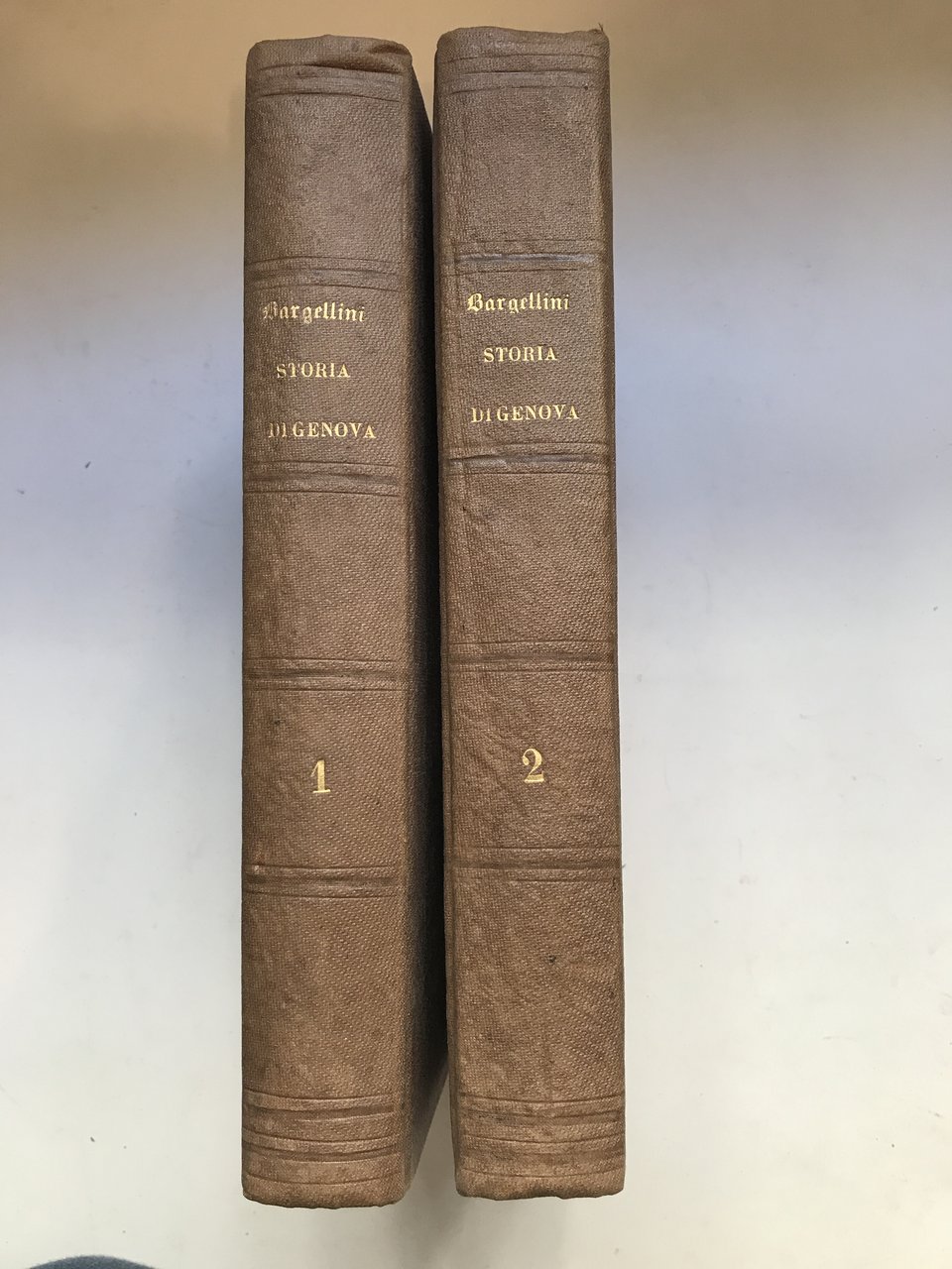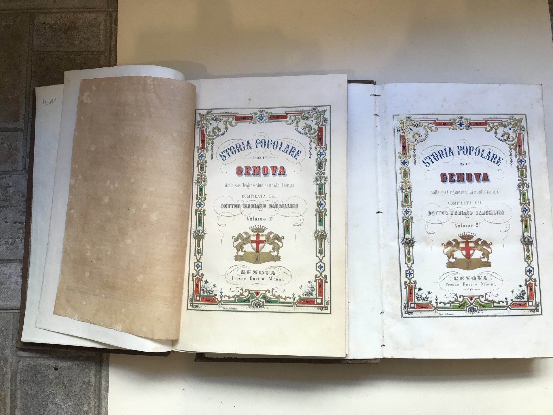 Due volumi in-4°, pp. XII, 612, 636, in entrambi i volumi doppio frontespizio di cui uno cromolitografico, 12 tavole f.t. in litografia finemente acquerellate, una pianta del porto di Genova, legature in tela editoriale con titoli in oro ai dorsi. Edizione originale Manno, 22494; Lozzi 2101