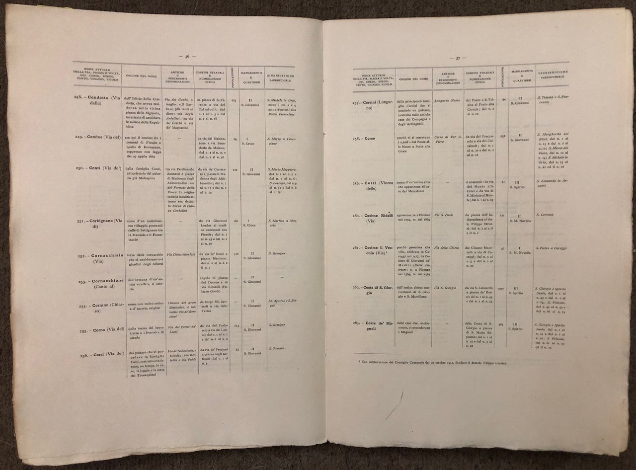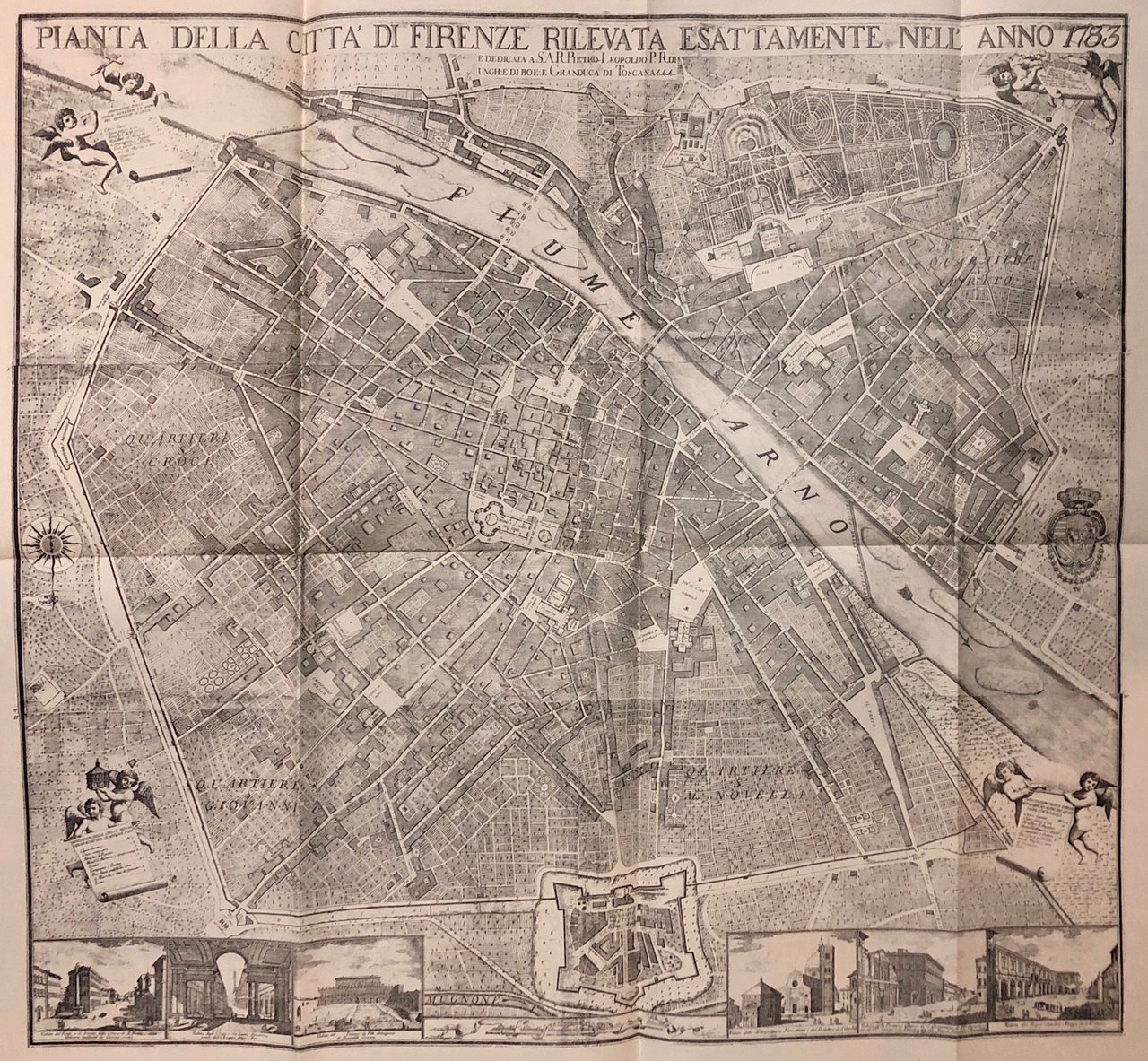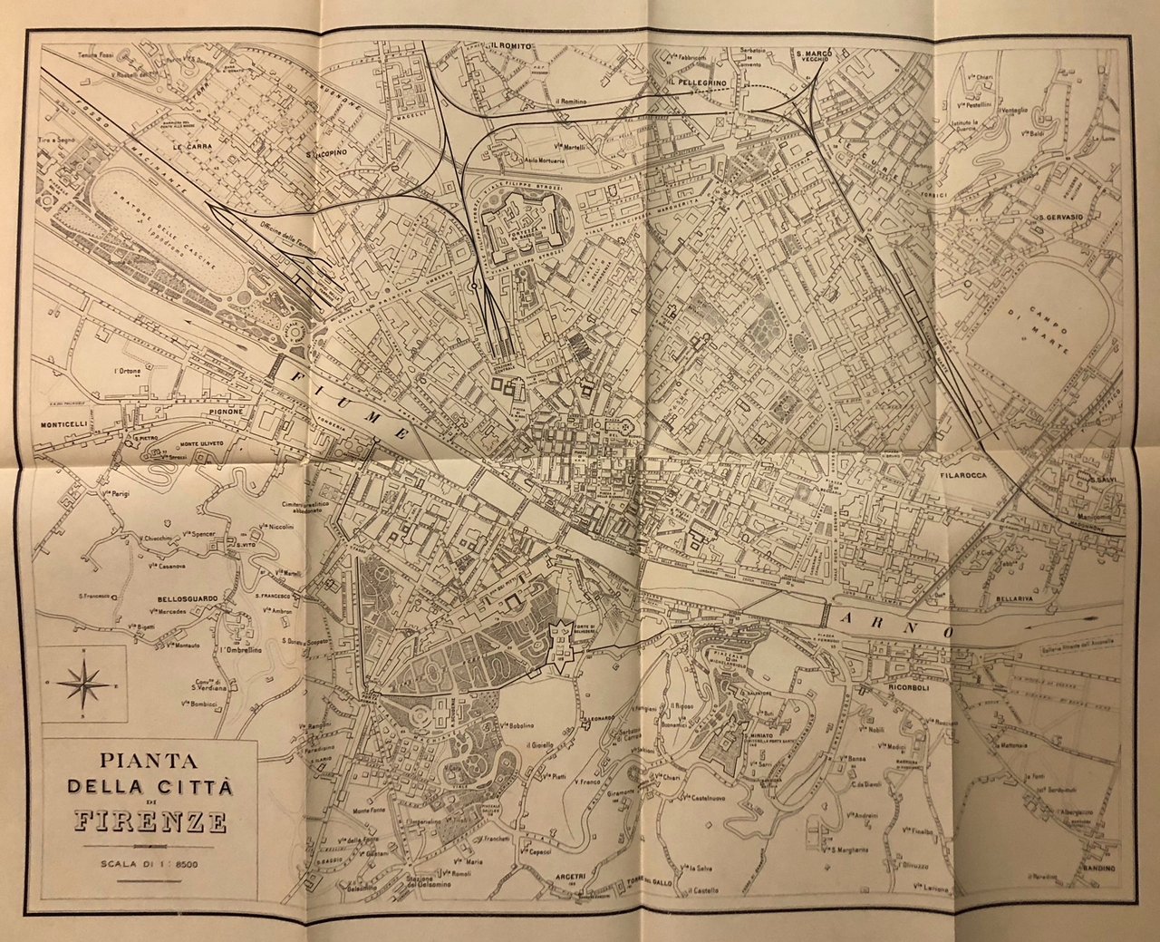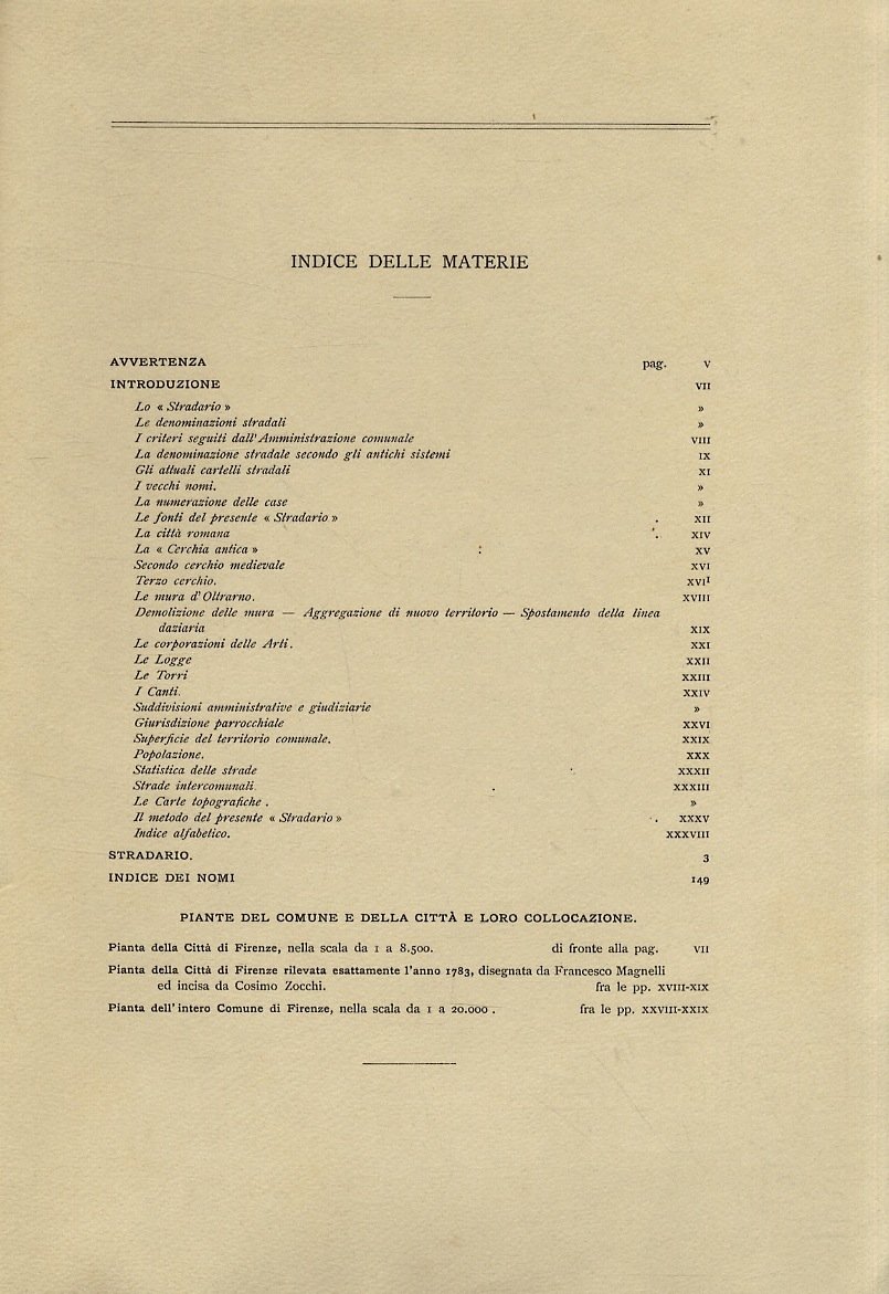 Firenze, Tipografia Barbèra, 1913, in-4, br. editoriale con giglio in rosso sulla coperta anteriore, pp. XXXVIII, 165, [3]. Con tre grandi piante più volte ripiegate f.t. (raffiguranti la "Pianta della Città di Firenze in scala 1:8.500", la "Pianta della Città di Firenze rilevata esattamente nell'anno 1783" e una carta del Comune di Firenze in scala 1:20.000). Stampato su carta grave. Piccole mancanze esterne, ma buon esemplare.