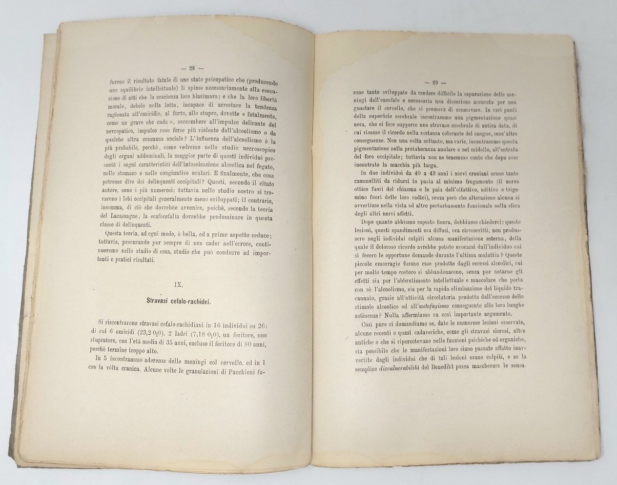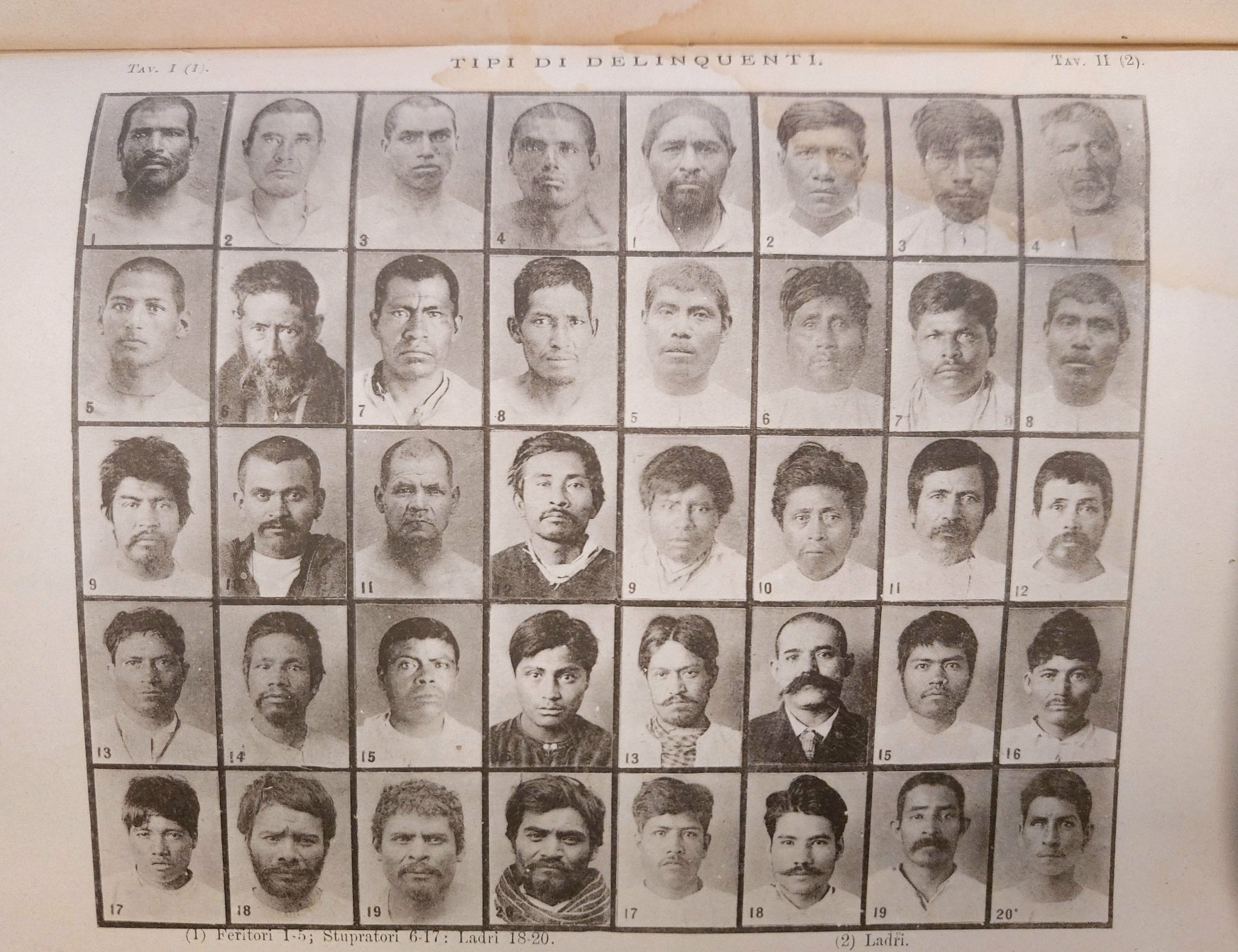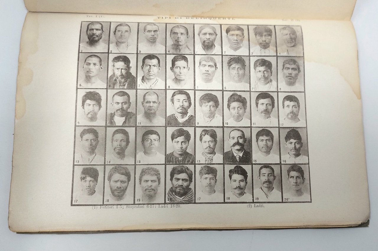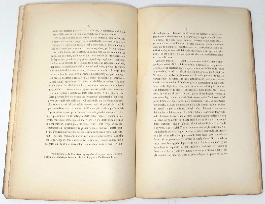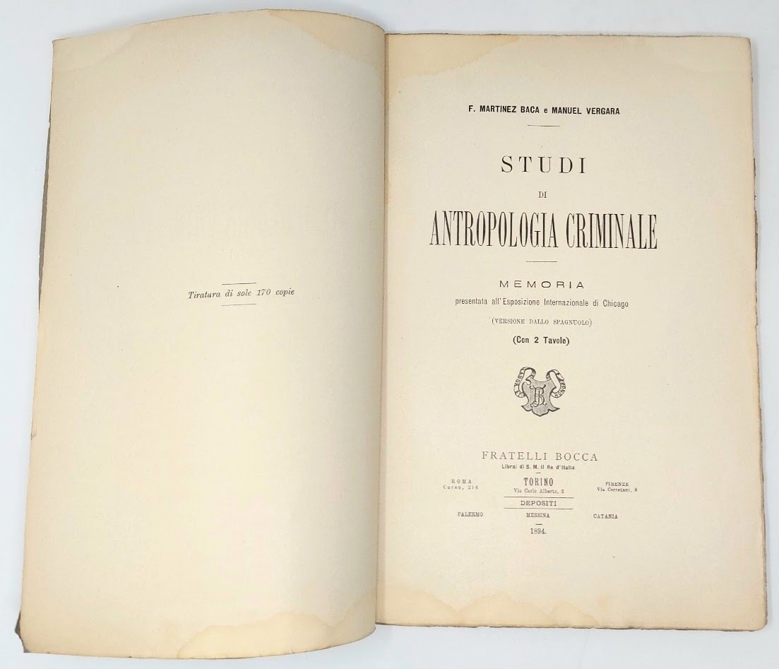 >in-8 (250x160 mm), pp. 81, in fine la tavola dei "Tipi delinquenti" numerata Tav I e Tav II;  brossura muta, piatto anteriore della brossura editoriale conservato. La tavola raffigura i tipi di delinquenti e li divide in due sezioni. Tavola I: feritori, stupratori e ladri; tavola II: Ladri. Studio di antropologia criminale ad opera di Martínez Baca, Francisco (Medico Militare dell'Esercito Messicano, Professore di Patologia Esterna presso la Scuola di Medicina e Farmacia Statale, Medico presso il Penitenziario e Capo del Dipartimento di Antropologia dello stesso) e Manuel Vergara (Assistente Dipartimento di Antropologia). Interessante trattato fatto tradurre da Lombroso e pubblicato nella sua collana editoriale presso Bocca ("Biblioteca antropologico-giuridica"). Rara pubblicazione, ben conservata ma con alone d'umido nella parte centrale del volume, intonsa.