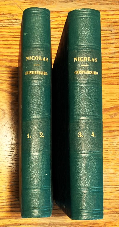Versione italiana della terza edizione francese riveduta (I: ed.: Paris, 1842. Nel periodo di stampa dell'ed. Torino, 1855 a Parigi stava già uscendo la VII ed. riveduta dell'opera, v. Sommario). Opera in quattro volumi rilegati in due tomi in-8 in mezza pelle (dorso: pelle verde con nervi e con titoli color oro - angoli piatti: pelle chiara - piatti: marmorizzati in verde/nero. Legatoria di Libri e Negozio di Carta di Vittoria Fumero, Via Po N.^ 43, Torino: etichetta adesiva applicata nell'ultimo foglio di guardia dei due volumi, rosa/color oro al primo tomo e rosa chiaro/color oro al secondo tomo). Pagine con i tagli colorati in verde e con il taglio anteriore concavo. Stato buoono dell'opera nel complesso (leggera usura delle copertine ai margini - pagine ingiallite). - Volume primo, pp. 376: - Approvazione di M. Arcivesscovo di Bordeaux; Ferdinando, arcivescovo di Bordeaux - Lettera del R. P. Lacordaire al sSgnor Augusto Nicolas, Autore degli Studi filosofici intorno al Cristianesimo; Fra Enrico Domenico Lacordaire de' Frati Predicatori - Avvertimento dell'Autore; A. N., Marzo 1846 - Ai Signori Avvocati della Curia di Bordeaux; A. N., Bordeaux, Marzo del 1842 - Prefazione della prima Edizione - Introduzione (Carattere del Subbietto - Fondamenti della certezza morale - Obbiezioni preliminari - Piano dell'opera) - Libro primo (L'anima - Dio - Immortalità dell'anima - una religione naturale - Necessità d'una rivelazione primitiva - Necessità d'una seconda rivelazione) - Libro secondo (Rapporto fra le due rivelazioni-Esposizione - Mosè (Sua antichità, suo carattere, e carattere de' suoi scritti-il popolo ebreo - Mosè di rincontro alle scienze; sua ispirazione dimostrataz - Mosè studiato nel racconto della caduta dell'uomo in Adamo, e della proomessa della sua riabilitazionbe in Gesù Cristo) - La anatura umana-studio psicologico sul fatto della caduta e della riabilitazione - Tradizioni universali (Sul fatto della cadduta - Sui sacrifici - Su l'espettazionbe della riabilitazione) - Della venuta e del regno di Gesù Cristo - Riassunto-Conclusione - Prove intrinseche (Preambolo-transizione - Esposizione della morale evangelica - Del dogma cristiano - Dio, sua natura e suoi attributi - Il cielo - Il purgatorio - L'inferno) - Lettera di Felice Lajard all'Autore sulle tradizioni assire e persiane; Vostro Umil.mo e Dev.mop Servitore felice Lajard, Parigi 5 maggio 1850 - Aggiunte della settima edizione ("erano già stampate le prime 96 pagine del presente volume, quando uno zelante Pastore di anime, associato alla biblioteca ecclesiastica ci faceva avvisati che la settima edizione stampata recentemente a Parigi, era stata arricchita dal ch. A. di alcune note, e gentilmentee ce le favoriva. Mentre faremo tesoro di tali aggiunte per le pagine e volumi a stamparsi non vogliamo privare i signori associati di quelle concerneti le pagine stampate, percciò quivi le trascriviamo a guisa di appendice. Quelle che aspettano al vol. 1^ saranno indiirizzate ai medesimi in un foglio a parte (?)", nota a p. 367) - Avvertenza; - Volume secondo, pp. 416: Prove intrinseche (La redenzione-suoi insegnamenti - La redenzione-sue applicazioni - La Trinità - La Chiesa - Del protestantismo - "Fuori della Chiesa non c'è salvezza" - La grazia ed i sacramenti - La confessione - L'eucarestia - Culto e cerimonie - Conclusione) - Prove estrinseche, o istoriche (Prologoo - Della persona di Gesù Cristo - Gli evangeli - Le profezie - I miracoli - Stabilimento del cristianesimo (Nell'ordine morale - Nell'ordine intellettuale - Nell'ordine sociale) - Stabilità del cristianesimo della perpetuità della sua coostiituzione cattolica - Conclusione - Epilogo).