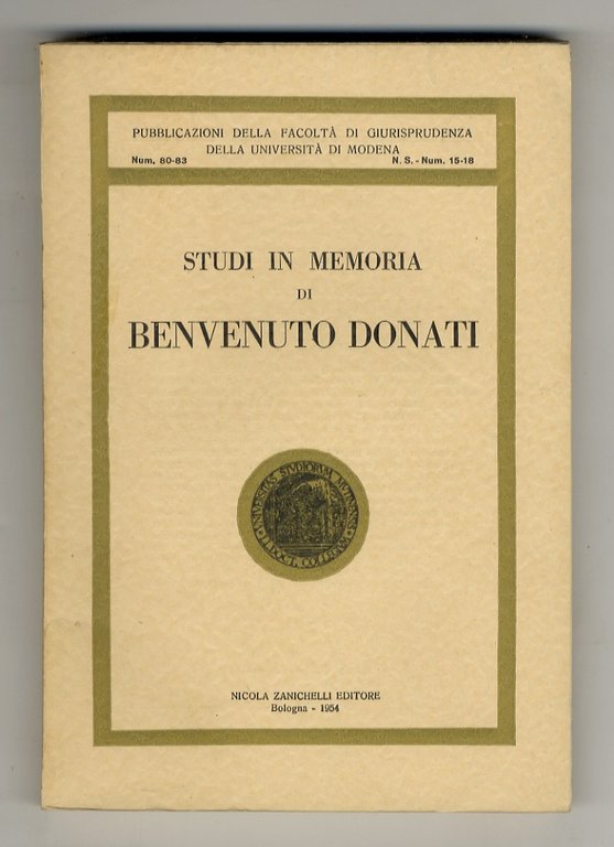 Bologna, Nicola zanichelli, 1954, in-8, brossura editoriale, pp. 224, [4]. Con ritratto di Donati f.t. Scritti di Gioele Solari, Marcello Finzi, Giuseppe Ignazio Luzzatto, Carlo Guido Mor, Luigi Federici, Antonio Amorth, Walter Bigiavi, Aldo Formiggini, Bruno Rossi, ecc. Volume che nasce con l'occhietto che ha funzioni di frontespizio. Ottime condizioni.