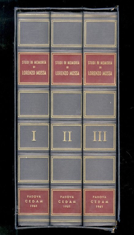 Padova, CEDAM, 1961, volumi 3, in-8, tela editoriale, cofanetto (questo con frattura lungo due angoli), pp. XLVII, [1], 522, [2] - 616, [2] - [2], 637, [3]. Con ritratto di Mossa in antiporta del primo volume.