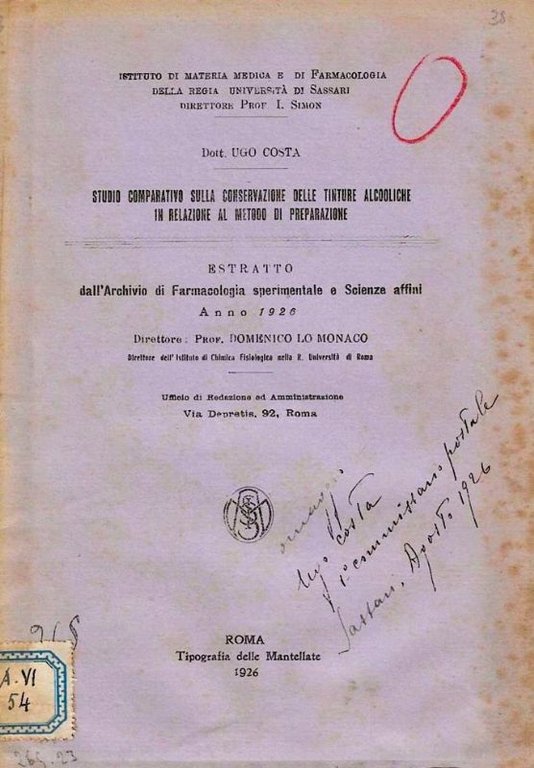 Studio comparativo sulla conservazione delle tinture alcooliche in relazione al metodo di preparazione. Estratto dall'Archivio di Farmacia sperimentale e affini.