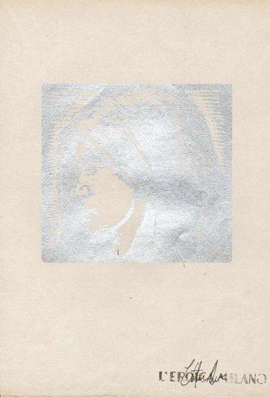 Foglio di cm 31,5 x 22 circa; l'immagine è stampata in inchiostro argento (cm 14 x 15). Prova di stampa della xilografia che andrà alla p. 25 del Quaderno 87-90 de L'Eroica, dedicato interamente a Giovanni Pascoli; al verso l'incipit della novella La Madonna del Pianto, di Maio Majoli; nell'angolo in basso a destra timbro 'L'Eroica Milano' e firma del direttore della rivista, Ettore Cozzani. Ottimo stato di conservazione. Armando CERMIGNANI (Castellammare Adriatico, 1888 - Roma, 1957) è stato pittore, incisore, ceramista e politico. Nato da una famiglia di artigiani, frequenta l'Accademia di Belle Arti di Bologna e, come allievo di De Carolis, si avvicina al mondo della xilografia. Inizia così una sua attività di illustratore di opere letterarie con le principali case editrici quali Laterza, Sten e Ricciardi. È volontario nel primo conflitto mondiale, viene ferito due volte e prigioniero è internato nel Lager di Celle, in Germania, dove conosce Gadda. Nel dopoguerra è a Pescara, dove si dedica all'insegnamento pur collaborando come illustratore a riviste quali Emporium e, soprattutto, l'Eroica di Cozzani. Si dedica anche all'illustrazione pubblicitaria e realizza le etichette del liquore Aurum e riceve vari incarichi di decorazioni pittoriche. Il suo studio, frequentato da vari artisti dell'ambiente pescarese, diviene un luogo sospetto di eversione antifascista e viene chiuso dalla polizia. Dopo la Liberazione viene nominato Prefetto di Pescara e intraprende una carriera politica che lo porta ad essere eletto Senatore nella prima legislatura. (da Wikipedia)