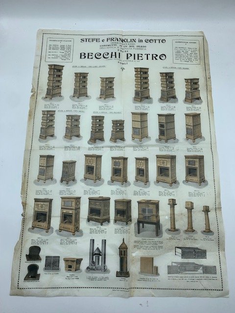 Manifesto pubblicitario con pieghe centrali (aperto misura cm 48 x 65 circa), qualche mancanza al margine interno del foglio, qualche foro centrale. Raro manifesto pubblicitario, con stampa al solo recto, con illustrazioni di 37 modelli di stufe prodotte da questa ditta di Forli', la eredi Pietro Becchi. In alto elenco delle onorificenze vinte dalla ditta ad alcune importanti fiere internazionali. Non datato ma ascrivibile al 1902 circa. Pietro Becchi, romagnolo di Forli', nel 1850, appena ventenne, si dedicava con il padre a lavori di edilizia. Questo tipo di lavoro lo costringeva spesso a dover intervenire nella riparazione di vecchie stufe in mattoni tenute insieme da cerchi di ferro. A Becchi venne quindi l'idea di creare una stufa simile, ma in cotto, monolitica e senza ferri. Il prototipo venne realizzato con un rudimentale stampo in legno: ne fabbrico' una ventina e le vendette con successo. Il successo fu tale che Becchi decise di creare una fabbrica destinata alla produzione di stufe. Cfr. Franco Magnani, "La stufa. Il fascino della tradizione", 1991, p. 14.