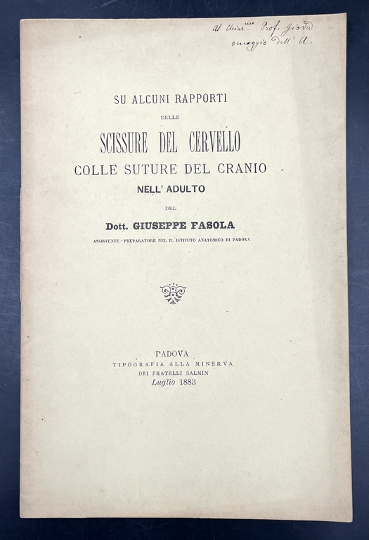 Su alcuni rapporti delle SCISSURE del CERVELLO colle SUTURE del CRANIO nell'ADULTO del Dott. Giuseppe Fasola. Con DEDICA.