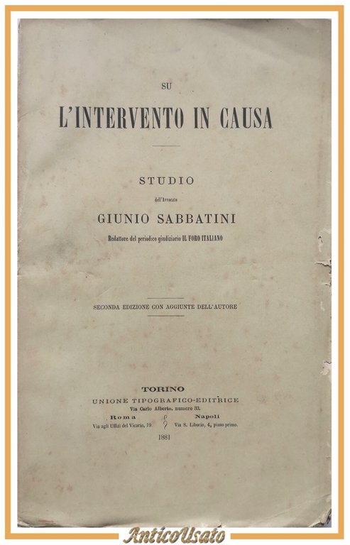 SU L'INTERVENTO IN CAUSA di Giunio Sabbatini 1881 UTET libro antico diritto