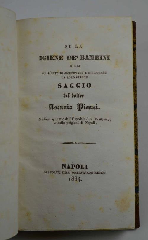 Pp. 150 (2). Unito a: SCARPA A. La igiene degli occhi ovvero consigli per preservare la vista… coll'aggiunta di alcune considerazioni sulle cagioni della miopia o vista corta. Napoli, Dalla Stamperia Francese, 1826. Pp. 118 (2). Unito a: Introduction pratique pour l'administration du Rob anti-siphilitique de Laffecteur. S.n.e. Pp. 16. Unito a: AUDIN-ROUVIERE. Compendio d'giene ovvero precetti generali per conservare la sanità e prolungare la vita. Napoli, 1828. Pp. 72. Quattro opere legate in un volume di cm. 17. Solida legatura coeva in mezza pelle, dorso liscio con titoli e ricchi fregi in oro. Ben conservato.