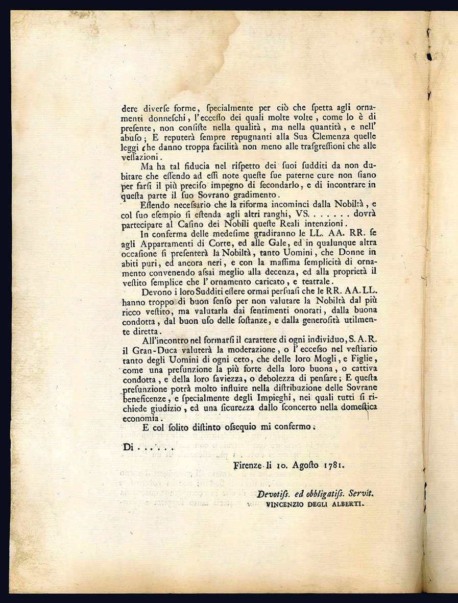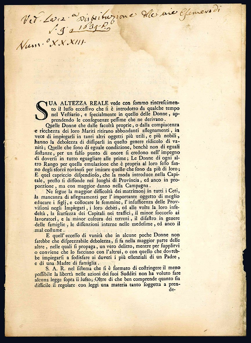 Sua altezza reale vede con sommo rincrescimento il lusso eccessivo che si è introdotto da qualche tempo nel vestiario, e specialmente in quello delle Donne�