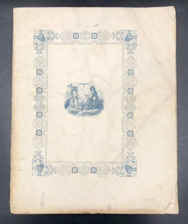 Tesi di laurea di cm. 25,3x20,4, pp. (4b), (20), (4b), bross. edit. bella illustr. e cornice ornata in verdolino ai piatti, cornice ornata al front. Alcuni angoli gualciti o con orecchie, ma buon es. De Pentateucho generatim. De divina Christi Gratia Magno DELFINO, a Cuneo cooptato canonico dal Capitolo nel 1850, nel beneficio canonicale 'Quaglia' e nel 1883 assunse il canonicato Delfino che gli spettava perché legato alla famiglia che aveva fondato quel canonicato. Fu rettore del Seminario, insegnante. (diocesicuneo.it).