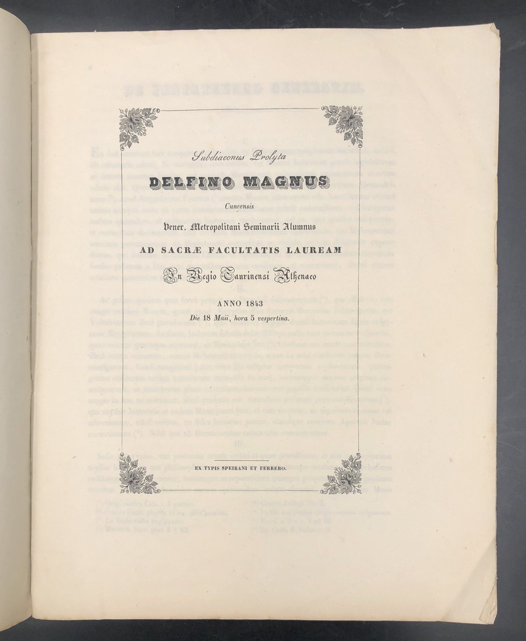 Subdiaconus Prolyta DELFINO Magnus Cuneensis, Vener. Metropolitani Seminarii aAumnus ad sacrae facultatis lauream in R. Taurinensi Athenaeo anno 1843, die 18 Maii, hora 5 vespertina.