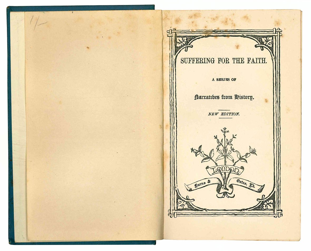 In 16mo (mm 163x102); pp. [5], 126- 256, 16. Fioriture diffuse.Tela editoriiale illustrata. Contiene: Massacre of the Carmes, Gabriel de Naillac, Magaret Clitheroe, Geronimo of Algiers, Chinese martyrs, Father Thomas. Pur essendo completo, la numerazione del volume inizia curiosamente da pagina 126.
