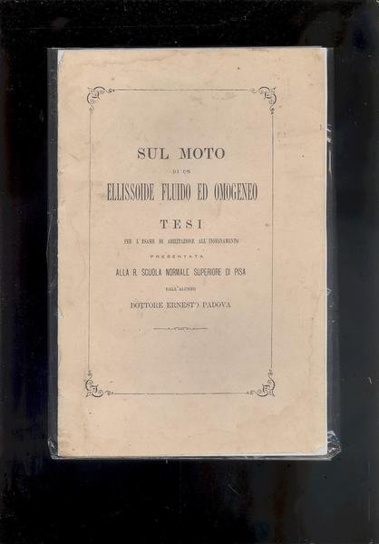 IN 8°, pp.87, COPERTINA EDITORIALE APPLICATA SU CARTONCINO. SCOPO DELLA PRESENTE MEMORIA E' DI COORDINARE IN UN SOL CORPO I RISULTATI OTTENUTI DAGLI INSIGNI GEOMETRI CHE HANNO STUDIATO LA QUESTIONE SOTTO IL PUNTO DI VISTA PIU' GENERALE, E DI SVOLGERE IL CASO IN CUI PERIODICAMENTE L'ELLISSOIDE RIPRENDE LA STESSA FORMA. ERNESTO PADOVA ( LI. 1845 - PD. 1896 ), MATEMATICO ITALIANO LAUREATOSI ALL'UNIVERSITA' DI PISA NEL 1866, DIVENNE PROFESSORE DI MECCANICA RAZIONALE ALL'UNIVERSITA' DI PISA NEL 1872, E NEL 1882, ALL'UNIVERSITA' DI PADOVA, DOVE RIMASE FINO ALLA MORTE. FU AUTORE DI OLTRE 50 LAVORI SCIENTIFICI RIGUARDANTI L'ANALISI, LA MECCANICA RAZIONALE E LA FISICA - MATEMATICA. LE DUE<BR>BROSSURE DELLA COPERTINA SONO APPLICATE SU CARTONCINO DI CUI LA SECONDA E' MANCANTE DI UN A PORZIONE NELLA PARTE ALTA, ALCUNE BRUNITURE DOVUTE AL TIPO DI CARTA, ALTRIMENTI OTTIMA CONSERVAZIONE. INTONSO.ID 3676