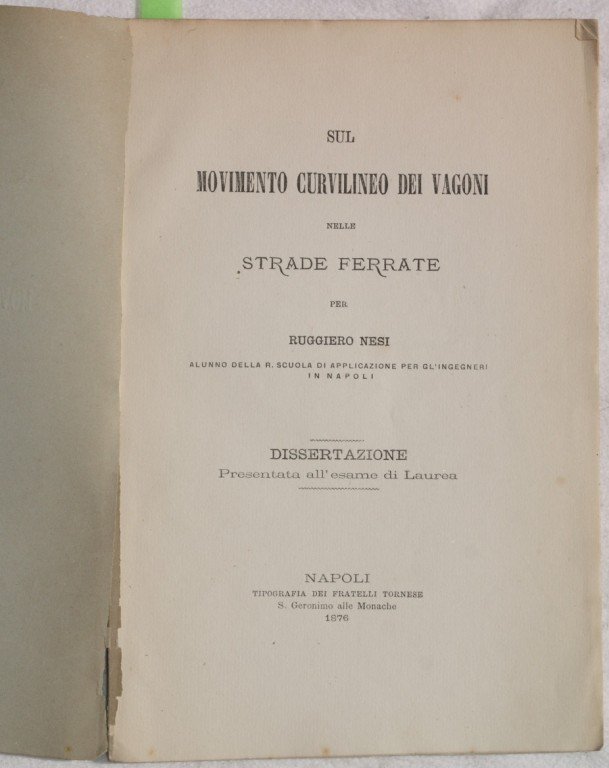 In 8. Dim. 22,5x15 cm. Pp. 31. Interessante e rara pubblicazione del 1876 sul movimento curvilineo dei vagoni nelle strade ferrate dell'ingegnere Ruggiero Nesi. Dissertazione presentata all'esame di laurea. Alla fine del volume è presente una planche ripiegata con diverse figure all'interno. Dedica autografa dell'autore in copertina. In ottime condizioni. Brossura editoriale in discrete condizioni generali con lievi usure ai margini e dorso; piatto anteriore quasi staccato. Legatura in ottime condizioni. All'interno le pagine si presentano in ottime condizioni con rare fioriture. Interesting and scarce pamphlet of 1876 about the curve movement of vagons in railway streets by the engineering Ruggiero Nesi. Dissertation presented in the degree examination. In the end of the volume there is a folded planche planche with different figures inside. Autographed dedication in the title page. In very good conditions. Editorial cover in fair general conditions slightly worn in the edges and spine; front plate almost detached. Binding in very good conditions. Inside pages are in very good conditions with occasional foxings.