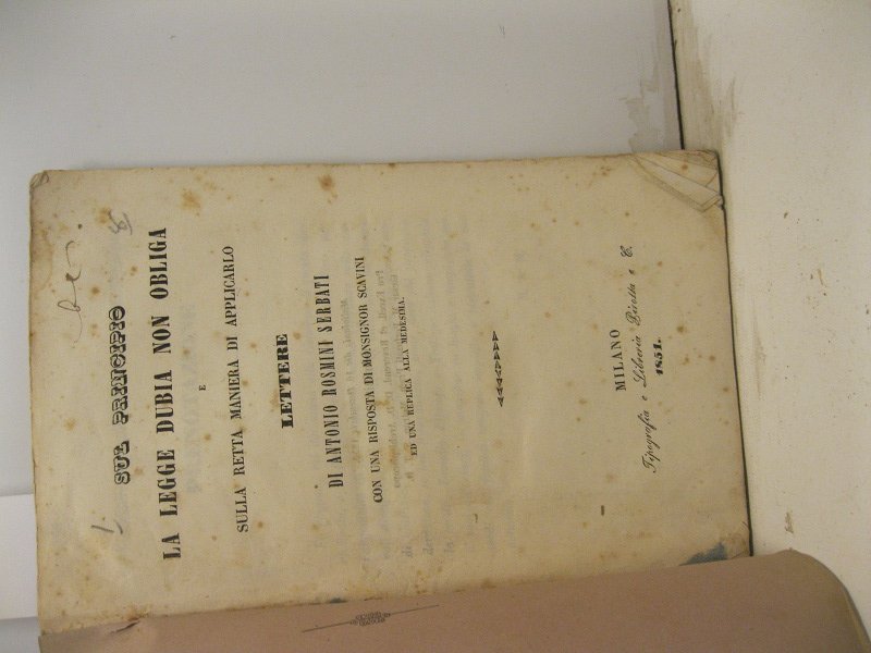 In 8, pp. 104. Fioriture alle cc. Br. muta coeva con taglietti ai margg. Seconda ediz. (la prima fu stampata nel 1850 a Casale Monferrato, presso Casuccio) di quest'opera in cui Rosmini critica le posizioni di Monsignor Scavini circa l'esatta interpretazione degli scritti del moralista S. Alfonso de Liguori.
