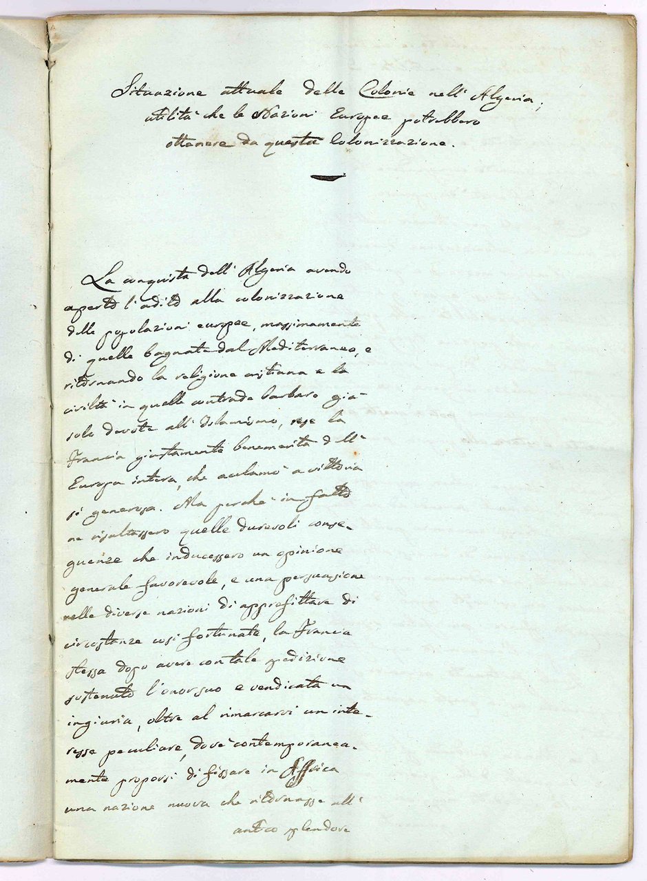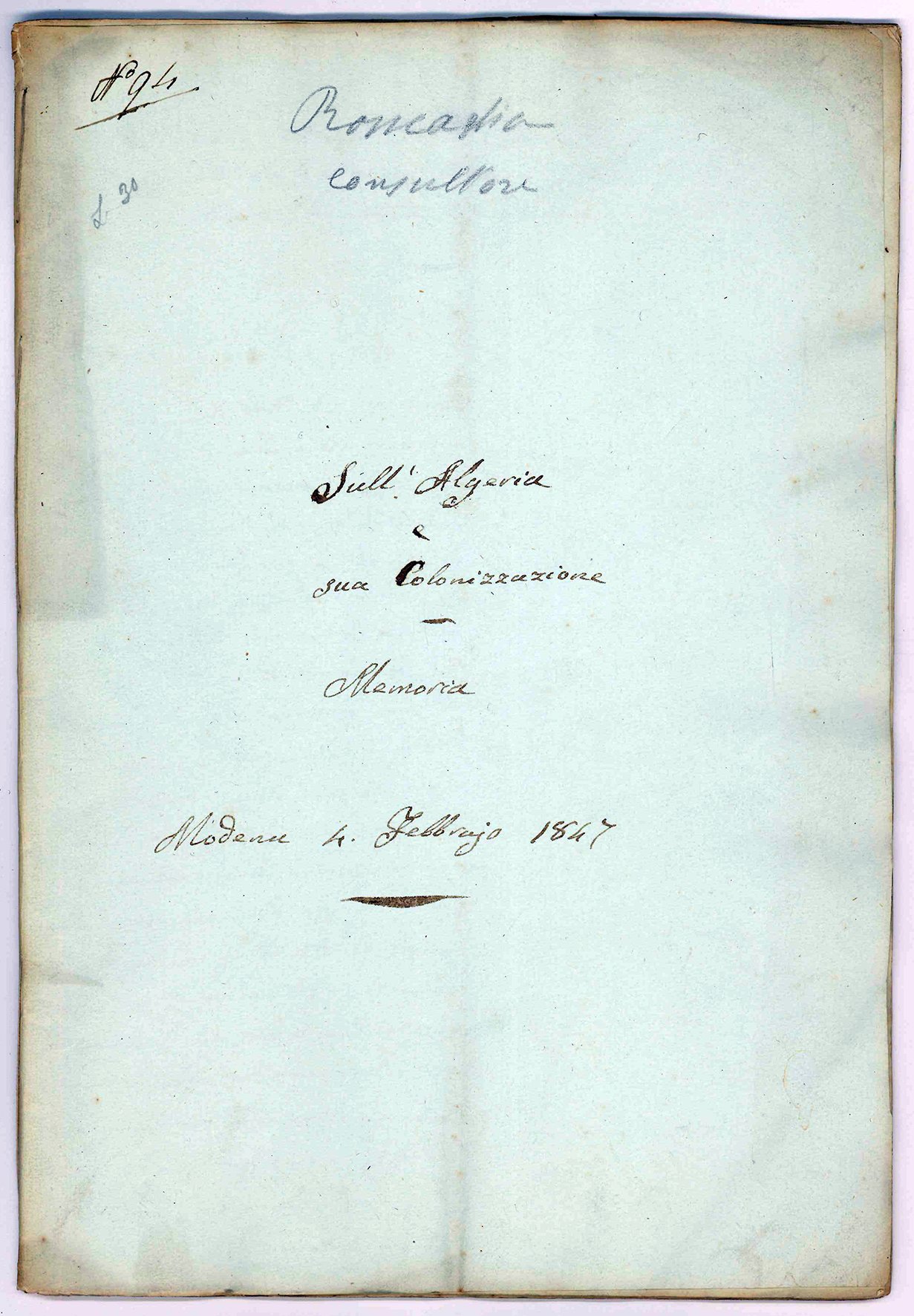 Sull'Algeria e sua colonozzazione. Memoria. Modena 4. Febbrajo 1847. Manoscritto autografo firmato in fine "Consultore Dottor Carlo Roncaglia"