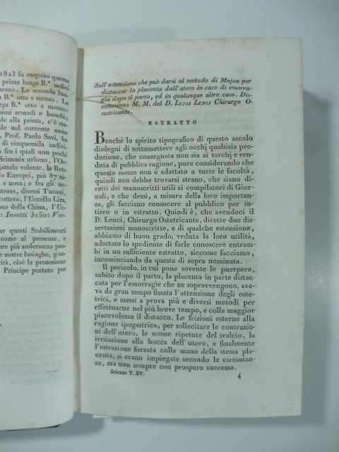 Sull'estensione che puo' darsi al metodo di Mojon per distaccare la placenta.(Segue): Degli accidenti che accompagnano il parto.(Stralcio da: Nuovo giornale de' letterati. N. 34. 1827)