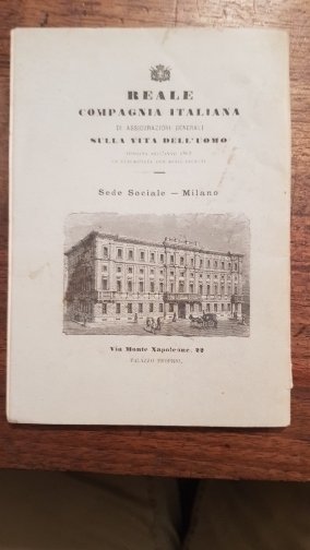 In-8°, pp. 74, brossura editoriale. Pubblicità e descrizione della Reale compagnia Italiana di assicurazioni Generali.