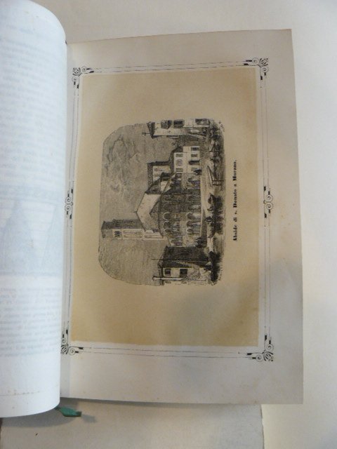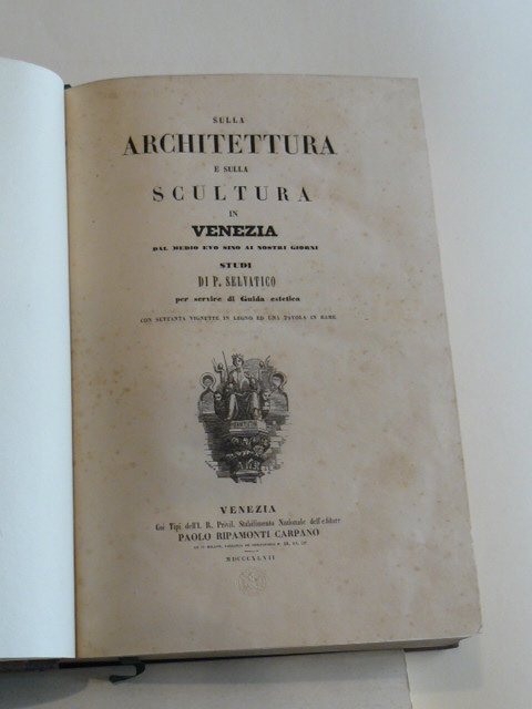 In-8° (235 x 160 mm), pp.XXIII, 529, (1) di errata, 70 tavole xilografiche n.t. e f.t. (le tavv. a p. pag. sono in seppia e protette da velina) e, tra le pp. 492-493, una tav. su doppia pag. riproducente sculture del Sansovino, di Pietro Lombardo. Legatura coeva in piena pelle, dorso a quattro nervi, titolo e fregi in oro. Prima edizione. L'opera è rigorosamente suddivisa per artista, con la descrizione dettagliata delle loro opere di architettura e scultura eseguite per gli edifici veneziani maggiori e minori. Fossati Bellani, II, n. 2345. Lozzi, II, n. 6127