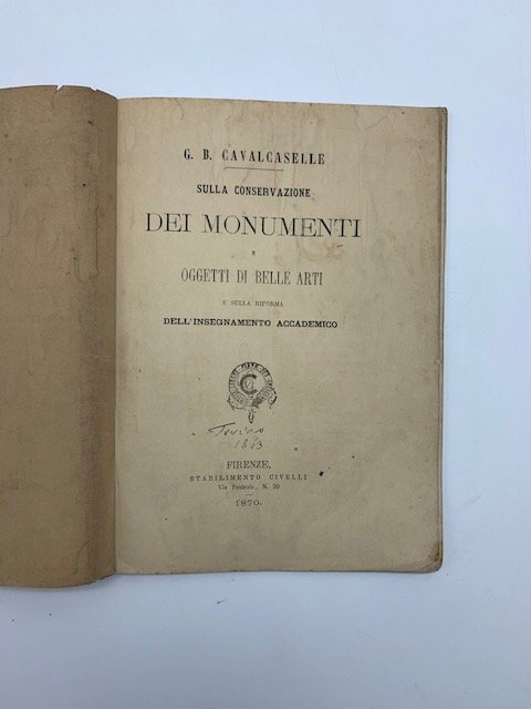 In 8 (cm 15 x 21), pp. 33 + (3). Annotazione manoscritta al frontespizio. Brossura muta coeva. Studio monografico di Giovanni Battista Cavalcaselle (Legnago, 1819-1897) sulla conservazione dei monumenti e beni culturali. L'Autore svolse un ruolo di primaria importanza non solo nella storia dell'arte, ma anche nella difesa del patrimonio artistico nazionale. Nel 1867 fu nominato ispettore delle Belle Arti presso il Ministero di Pubblica Istruzione.