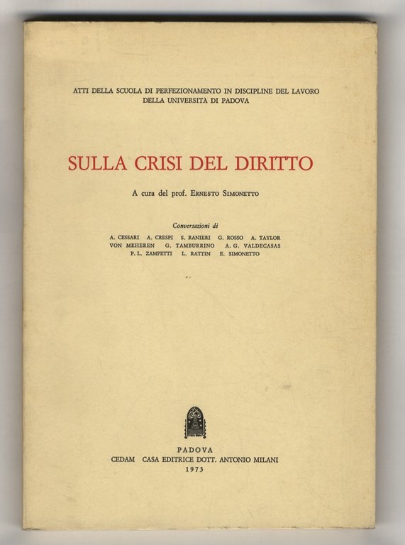 Sulla crisi del diritto. A cura del prof. Ernesto Simonetto. Conversazioni di A. Cessari, A. Crespi, S. Ranieri, G. Rosso, A. Taylor von Meheren, G. Tamburrino, A.G. Valdecasas, P.L. Zampetti, L. Rattin, E. Simonetto.