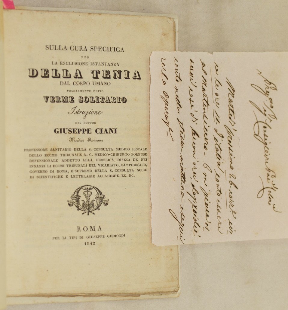 In 8 cm. 21,5x13,5. Pp. 56+(2) PL. Interessante pubblicazione medica del 1842 sulla cura della tenia o verme solitario dal corpo umano scritta dal Dottor Giuseppe Ciani.<BR>L'autore oltre al metodo utilizzato descrive casi reali di pazienti.<BR>Alla fine della pubblicazione due planches delle quali una ripiegata<BR>Insieme al volumetto una nota manoscritta di un dottore che fissava un'operazione chirurgica.<BR>In buone condizioni e completo. Copertina morbida posticcia in buone condizioni generali con lievi usure ai margini e dorso. Legatura in discrete condizioni con alcune pagine staccate. All'interno le pagine si presentano in buone condizioni con rare fioriture. Interesting medical pamphlet of 1842 about treatment of tenia worm by Dottor Giuseppe Ciani. The author describes the method used and real cases of patients.<BR>At the end of the pamphlet two planches of which one is folded.<BR>Together with the volume an handwritten note of a doctor fixing a surgical operation.<BR>In good conditions and complete. Soft false cover in good general conditions slightly worn in the edges and spine. Binding in fair conditions with some pages detached. Inside pages are in good conditions with occasional foxings. Slight water stains and usage signs.