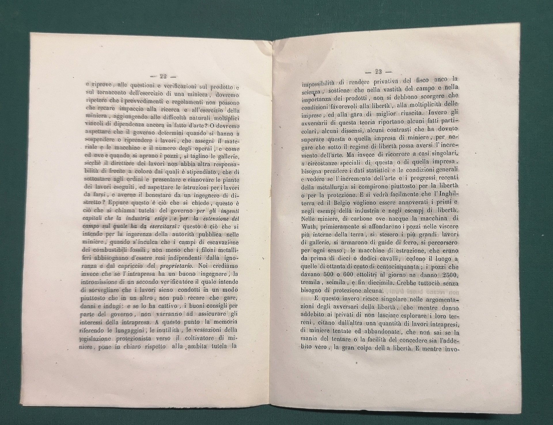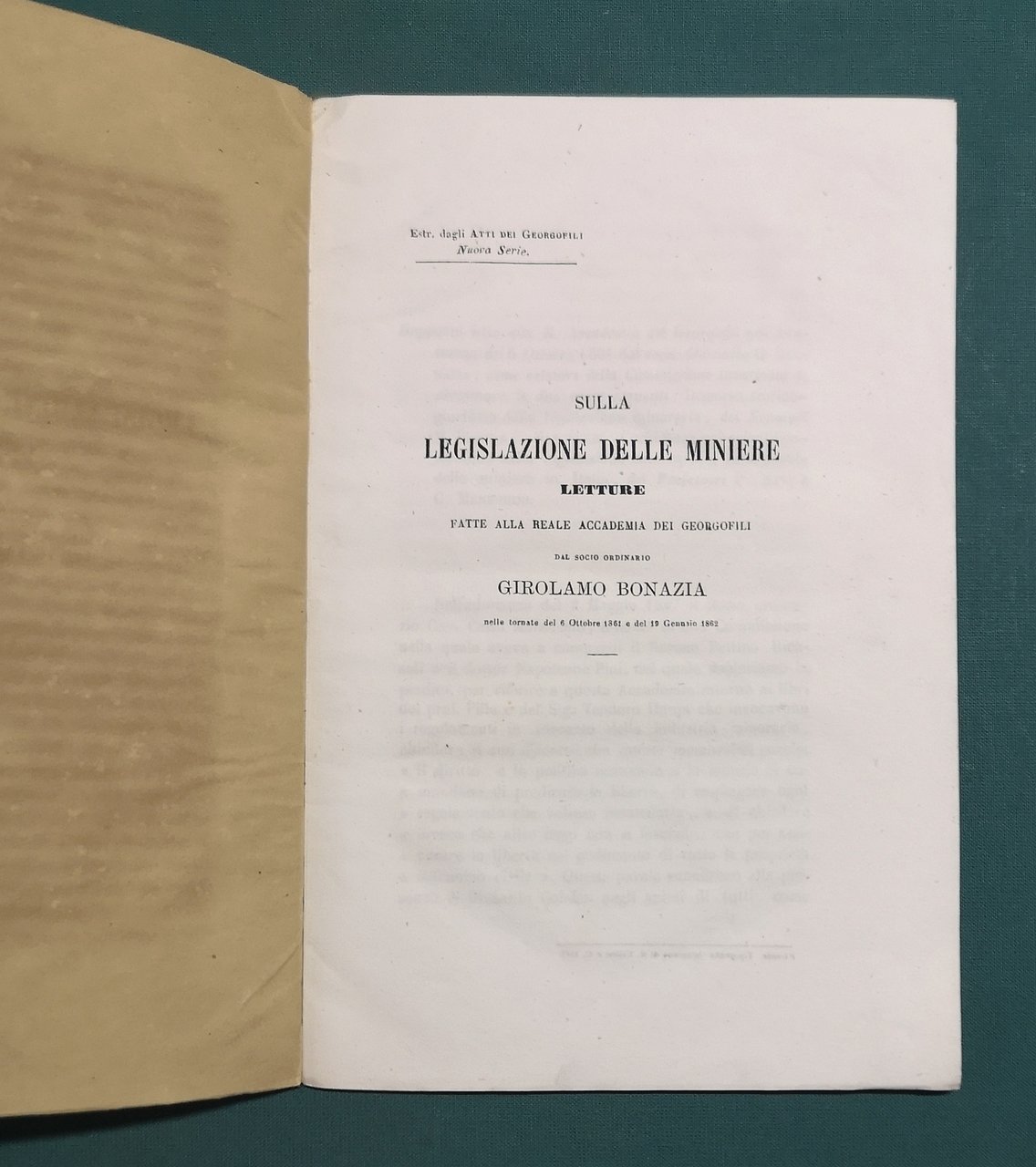 >in-8, pp. 44, legatura in carta muta coeva. Edizione originale, piuttosto rara, di questo opuscolo di argomento scientifico-giuridico sull'estrazione mineraria in Italia. Esemplare straordinariamente fresco, a fogli ancora chiusi.